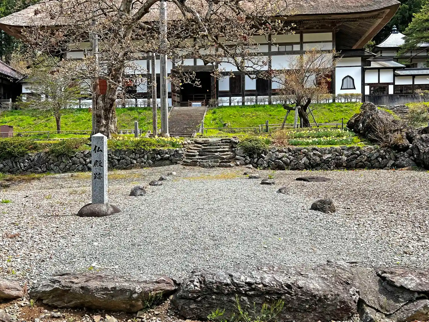 参道を進むと、いくつかの岩が規則的に並んでいる。その横に「仏殿跡」と書かれた石柱がある。本堂前の庭には、このような石柱がいくつも立っている。