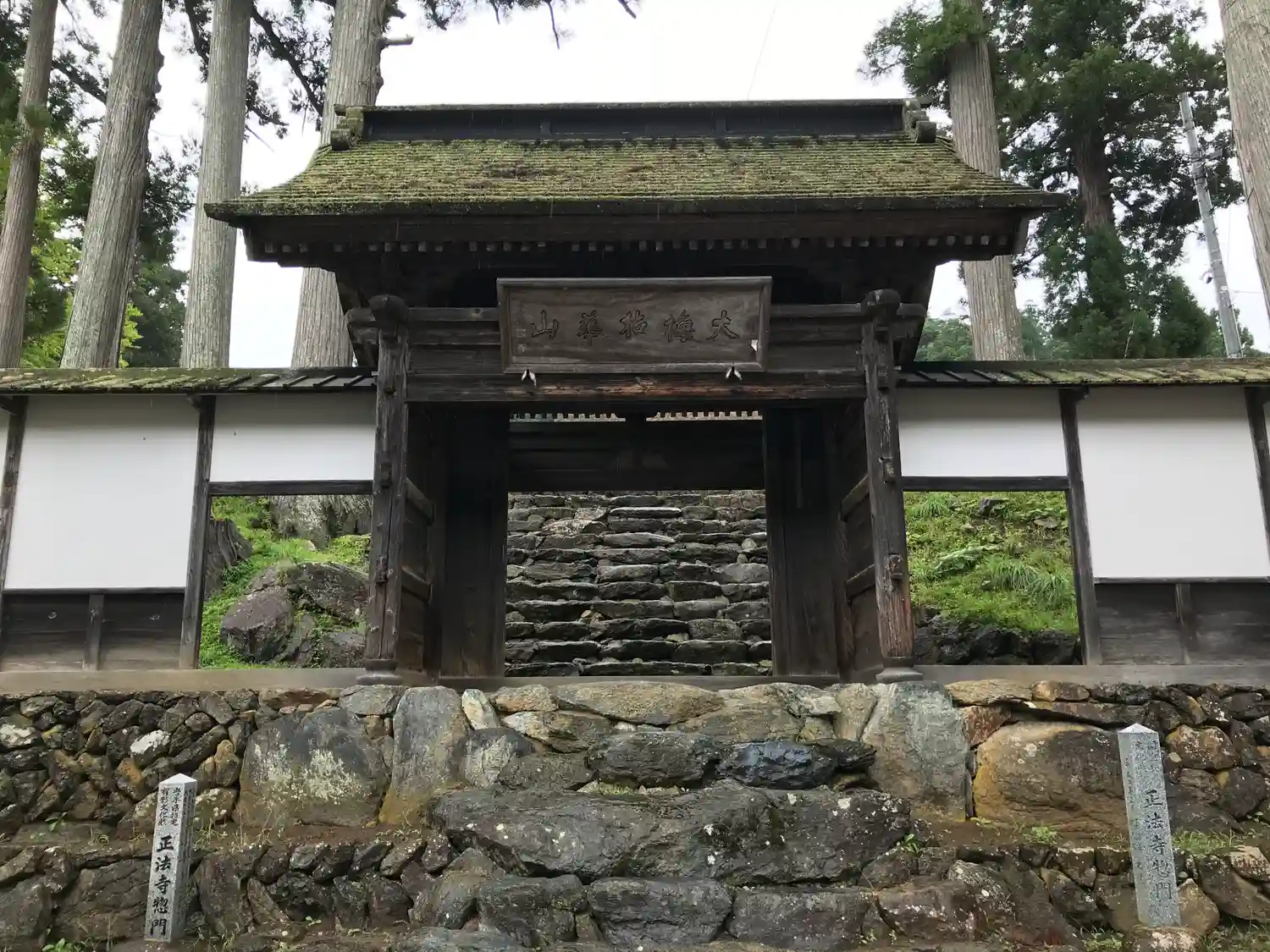 境内南西端全景。総門両脇の高木が、古刹であることを語っている。