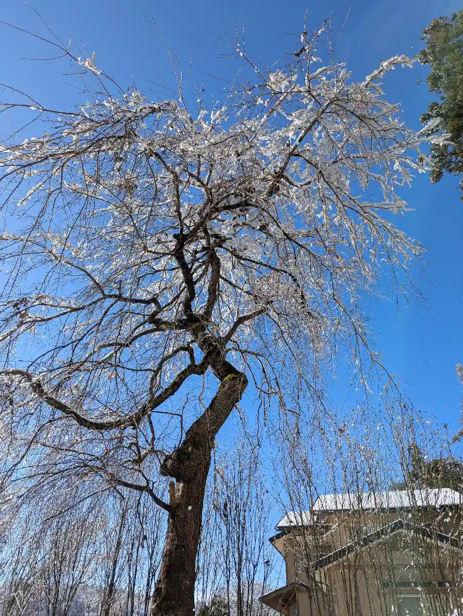 ちょうど雪が降っていて、枝垂桜も花をつけたようで綺麗でした。