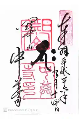 真ん中に梵字、左に関山中尊寺と書かれ、右上に印、真ん中に関山の印ち中尊寺の印が押されています。