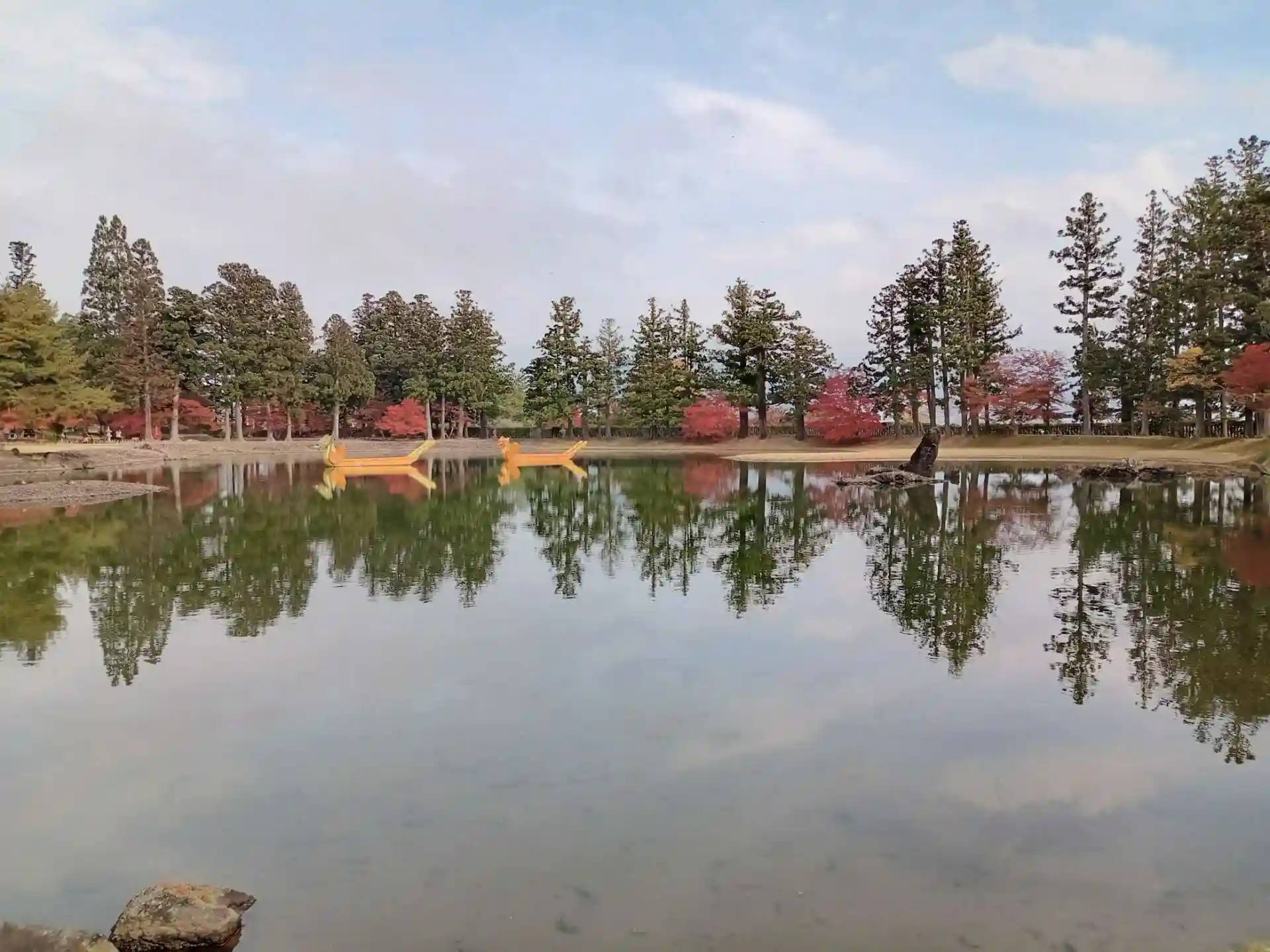 池を中心とする浄土庭園と平安時代の伽藍遺構がほぼ完全な状態で保存されており、国の特別史跡、特別名勝二重の指定を受けているそうです。