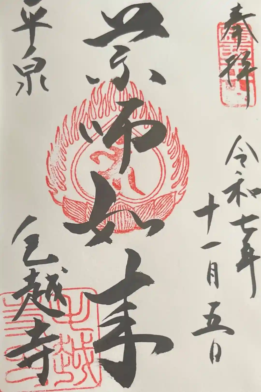 真ん中に薬師如来と書かれ、右上に醫王山(いおうざん)の印、真ん中に蓮華座に梵字(薬師如来)の火炎宝珠印、左に「平泉 毛越寺」の文字、左下に毛越寺印が押されています。