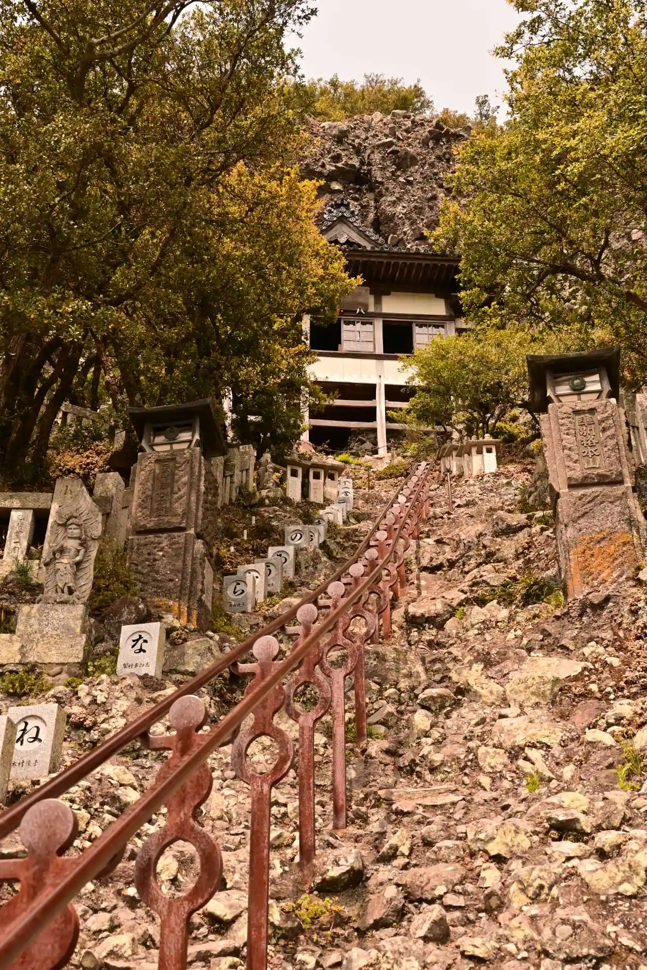 滝湖寺は、香川県小豆郡土庄町に位置します。滝湖寺から望む旧噴火山による313mの集磈石の山に第72番の奥の院 笠ヶ滝があります。滝湖寺では、3ヶ寺(第72番 滝湖寺、第72番奥之院 笠ヶ滝、第73番 救世堂)の納経を受け付けています。