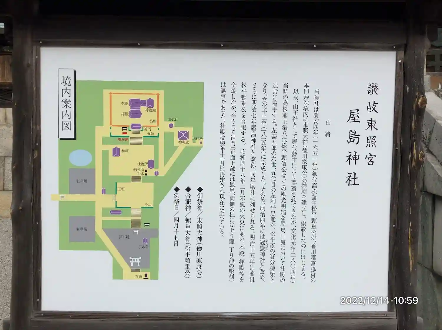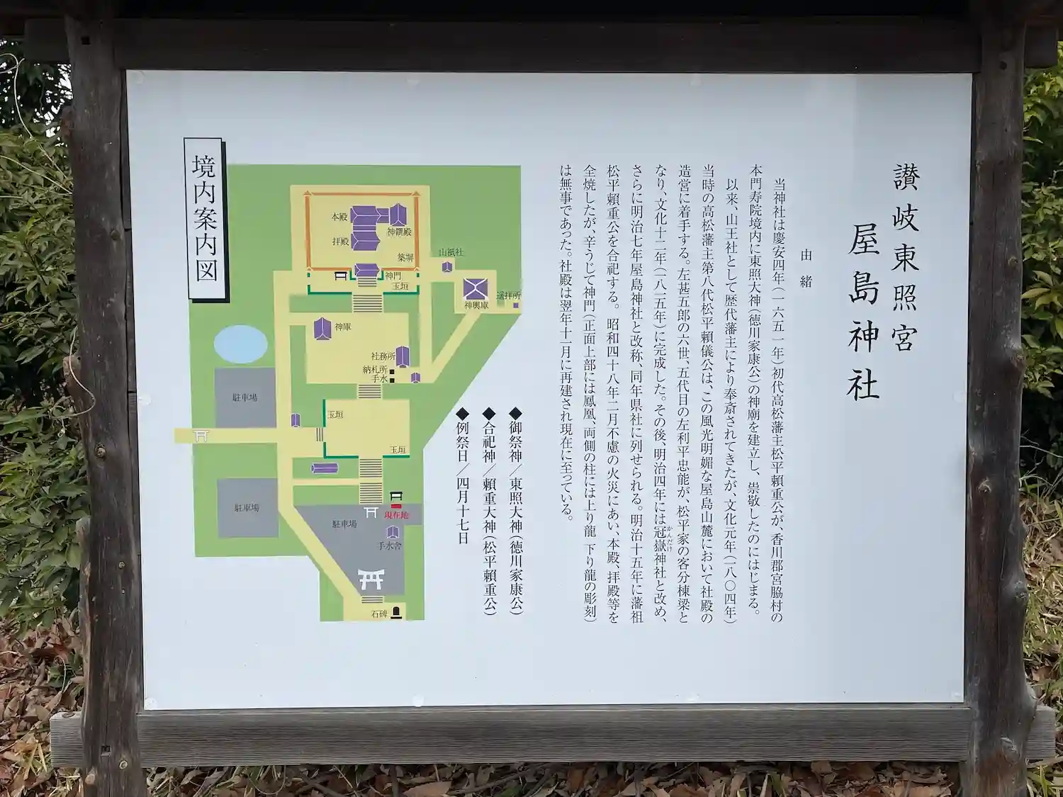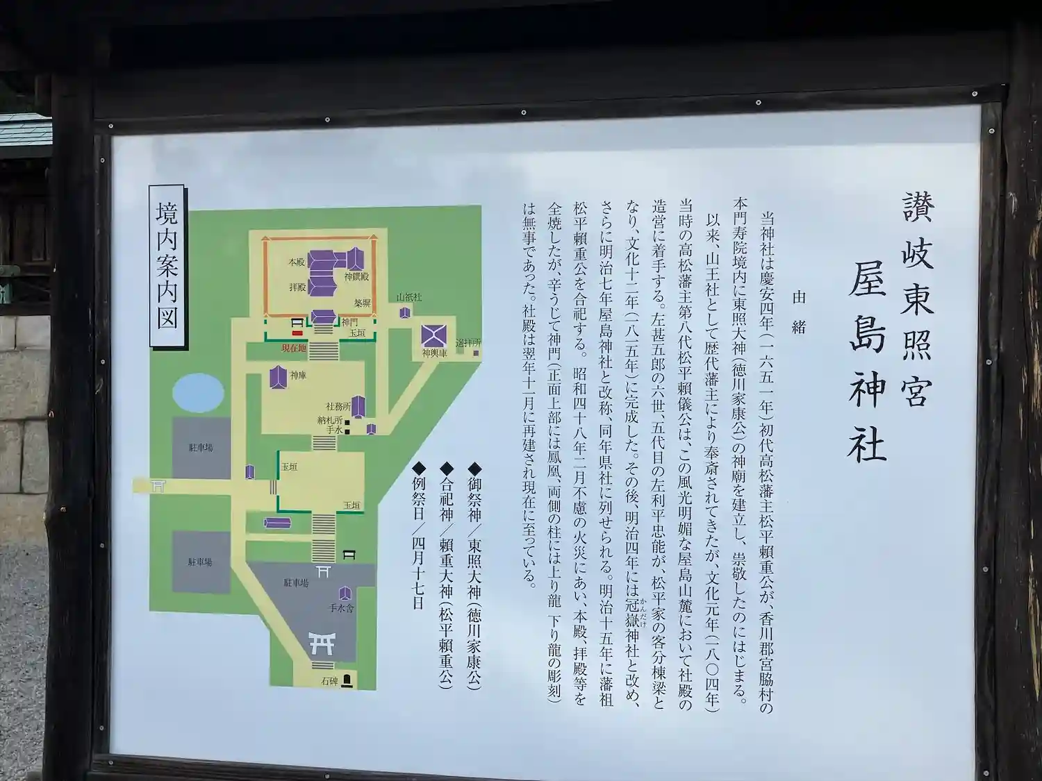 慶安4年(1651年)、初代高松藩主・松平頼重が、香川郡宮脇村の本門寿院境内に東照大権現(徳川家康…