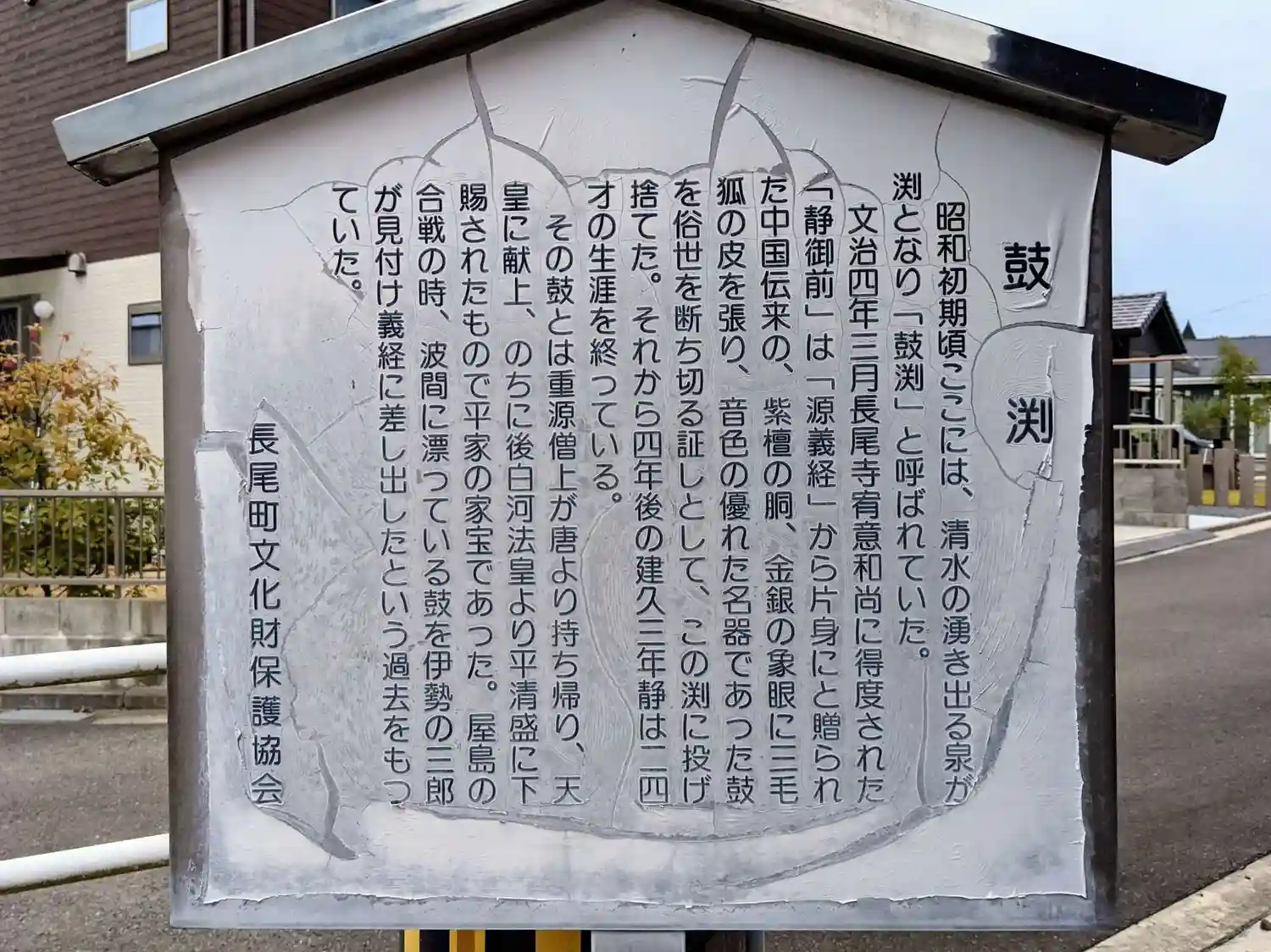 俗世への未練を断ち切るため、義経の形見"初音の鼓"(唐から伝わり後白河法皇が平清盛に下賜。紫檀の胴に雌雄の三毛狐の皮を張り、金銀を散りばめた、音色の優れた鼓だった)を小川の淵に投げすてたという場所