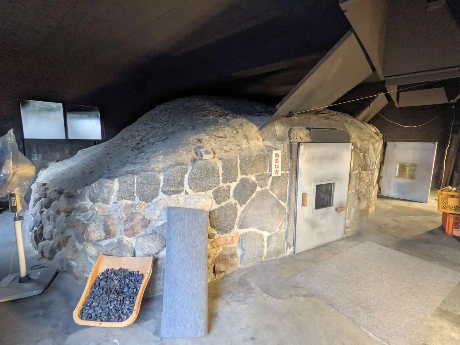 風呂は午前十時と午後二時の二回たくが、 その要領は先ず、松葉(小枝のついたまま) を石室の中でたき、次にぬれむしろとぬれご もを交互に重ねて、塩をまき、さらにその上にむしろを敷き、しばらく戸をしめ、むしておき、ひとえの着物に手ぬぐいをかむって入 室し、座布団の上に座って体を温めるもので 原理は近代サウナ風呂と一緒で、 中世ごろか ら私たちの先祖が、楽しんで来たといわれる 江戸時代には、高松藩士もよく使用したことで有名である。