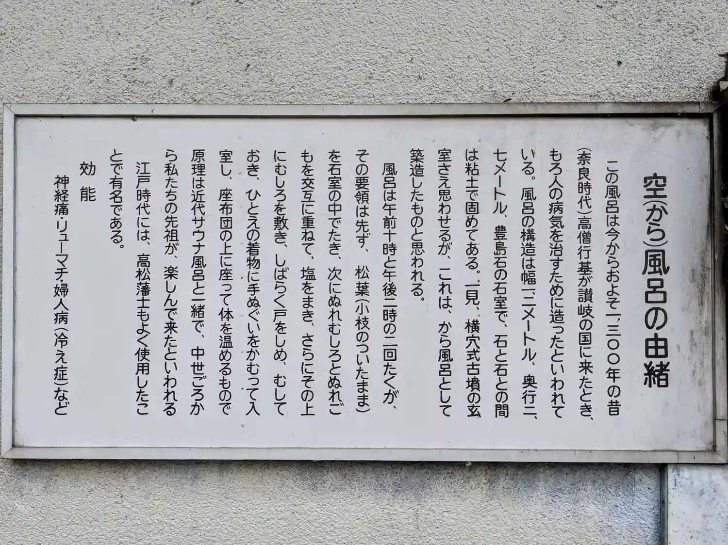 この風呂は今からおよそ一三〇〇年の昔 (奈良時代)高僧行基が讃岐の国に来たとき、 もろ人の病気を治すために造ったといわれている。風呂の構造は幅ニメートル、奥行二、 七メートル、豊島石の石室で、石と石との間 は粘土で固めてある。一見、横穴式古墳の玄室さえ思わせるが、これは、から風呂として築造したものと思われる。