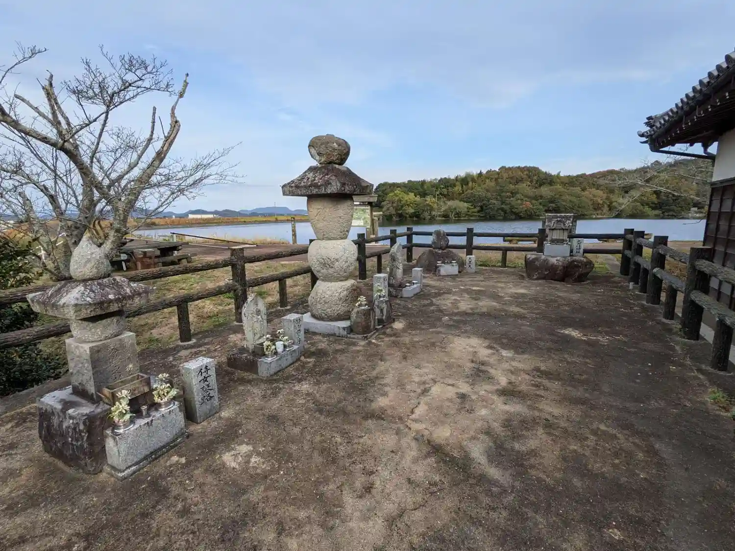 三木町井戸の鍛冶池のほとり、出家後の静御前が暮らした庵とお墓があります