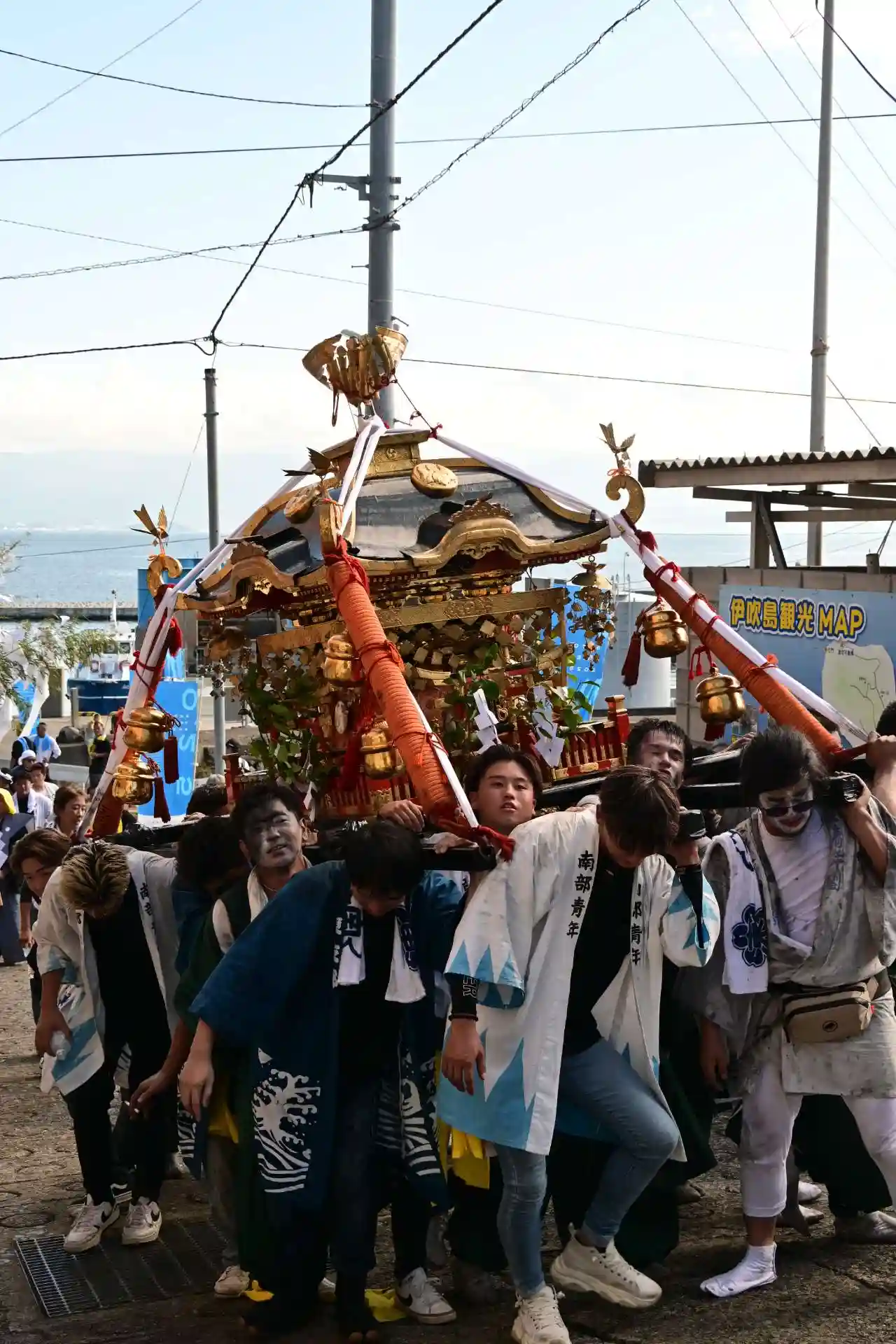 港近くまで戻ってくると、船渡御を終えた神輿に、また出会いました。みんないい感じにできています。宮入する伊吹八幡神社はまだまだ坂の上です。がんばってください!