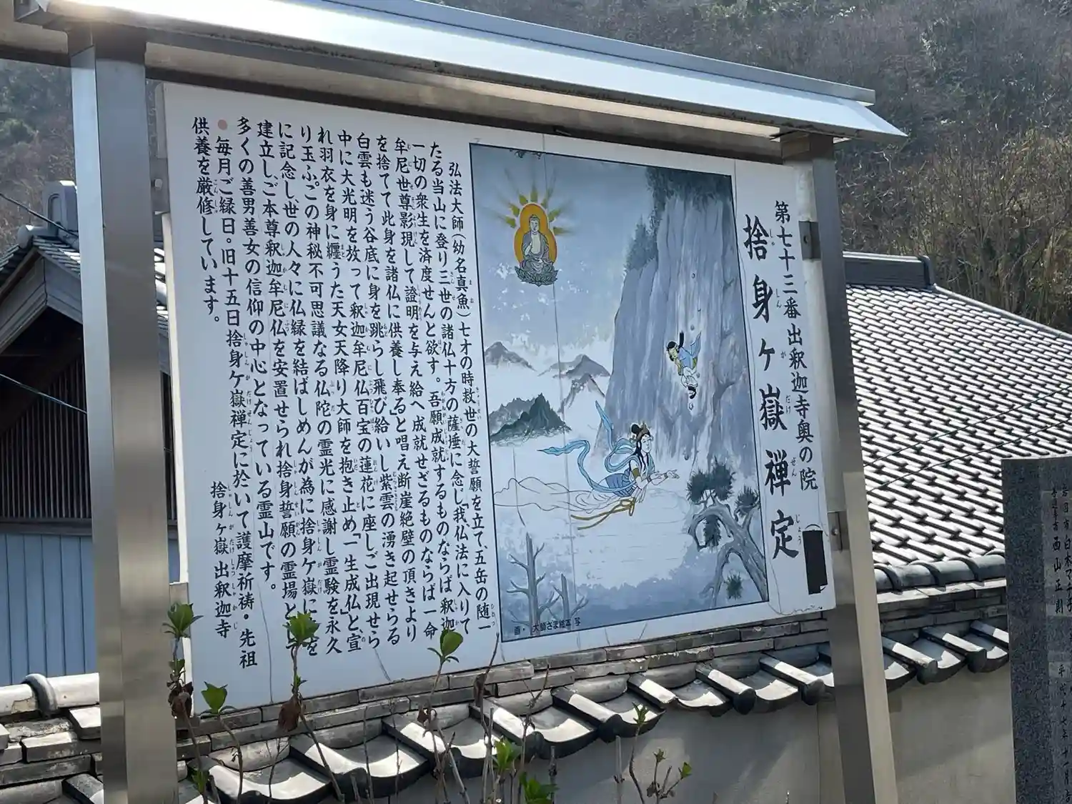 山門をくぐると、大師が身を投げた逸話が描かれた絵がある。