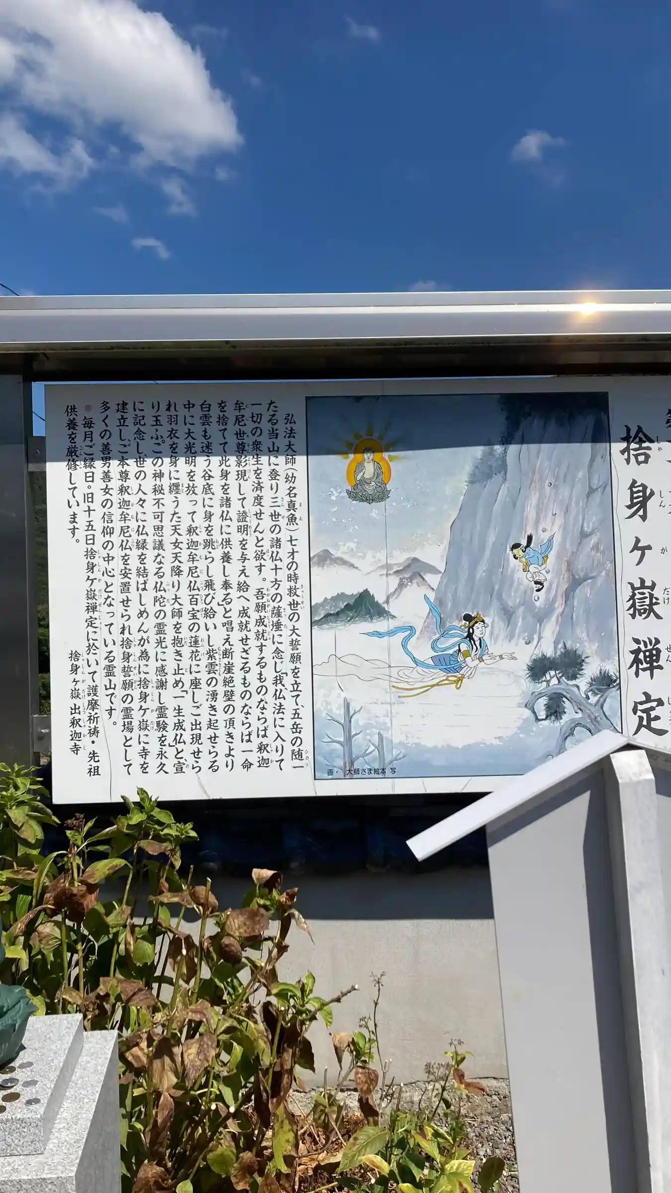 「捨身ヶ嶽」は、弘法大師が7歳の時「願いが叶うなら釈迦如来よ、姿を現したまえ」と、断崖絶壁から身を投げた場所。その時、釈迦如来と天女が舞い降り、紫雲の中で大師を抱きとめたとされる。(四国霊場開創1200年記念絵はがき)