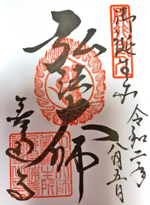 真ん中に弘法大師と書かれ、右上に御誕生所の文字と同行弐人の印、真ん中に梵字(弘法大師を表す弥勒菩薩の種字)の火炎宝珠印、左下に善通寺の文字と弘法大師御誕生所屏風浦善通寺之印が押されています。