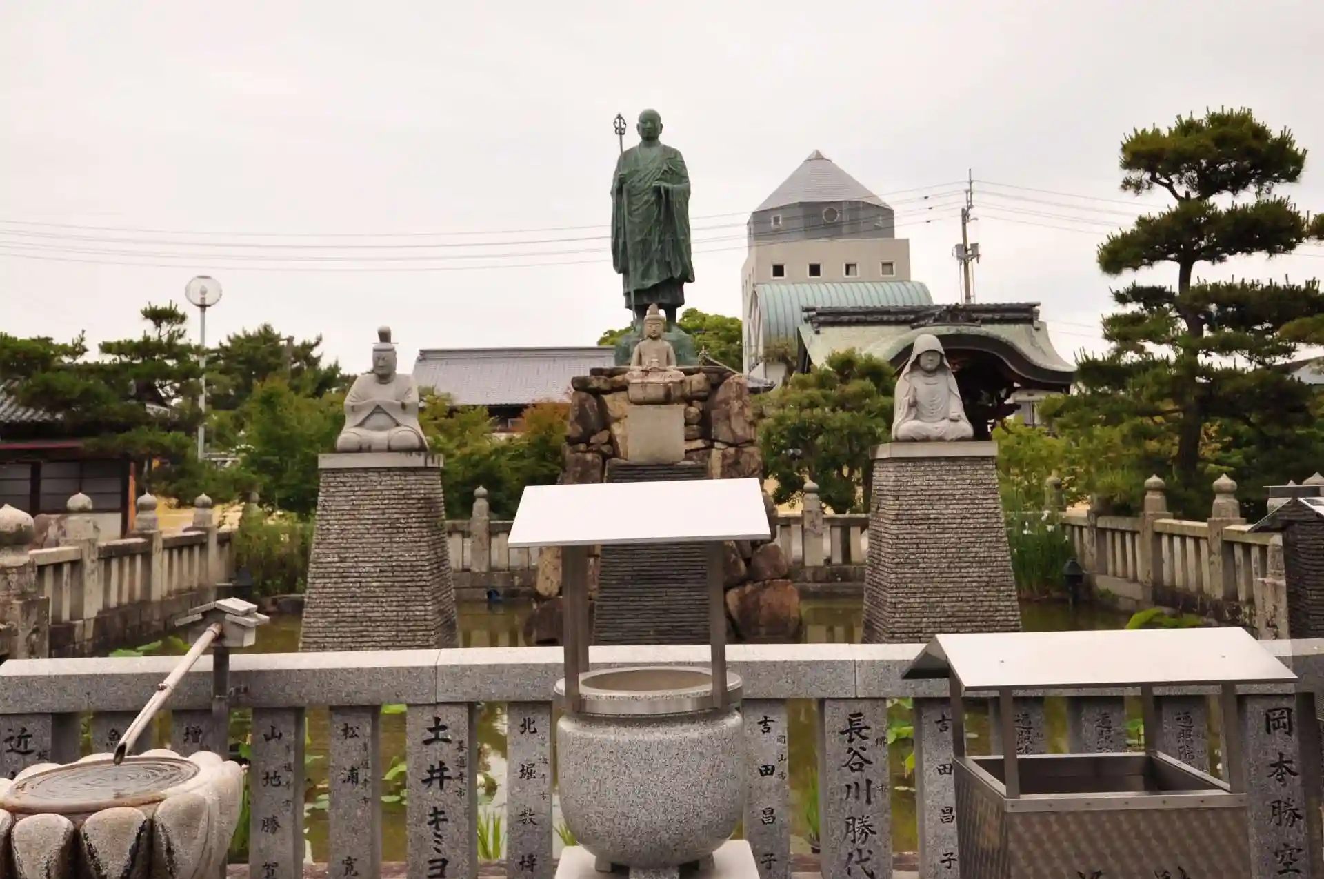 中央に弘法大師像・弥勒菩薩石像・両親の石像が立つ。大師が唐に渡るとき、別れを嘆く母・玉寄御前のために自画像を描いた際に我身を写したという池。