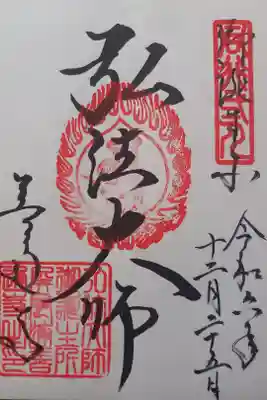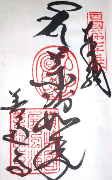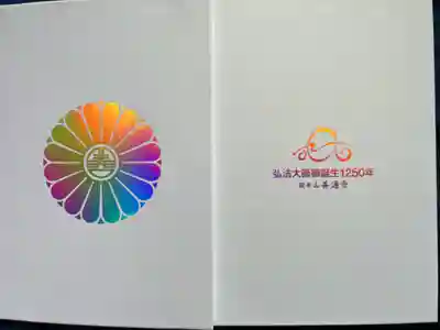 真ん中に弘法大師と書かれ、右上に同行弐人の印、真ん中に梵字(弘法大師を表す弥勒菩薩の種字)の火炎宝珠印、左下に善通寺の文字と弘法大師御誕生所屏風浦善通寺之印が押されています。