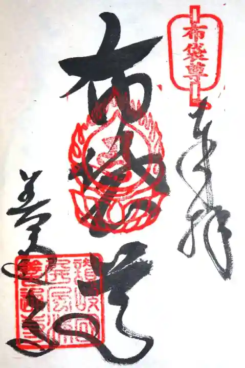 布袋尊と書かれ、右上に布袋尊の軍配印、真ん中に梵字(弘法大師を表す弥勒菩薩の種字)の火炎宝珠印、左下に善通寺の文字と讃岐國屏風浦善通寺が押されています。