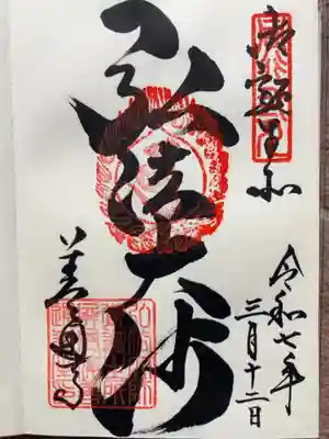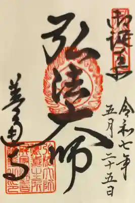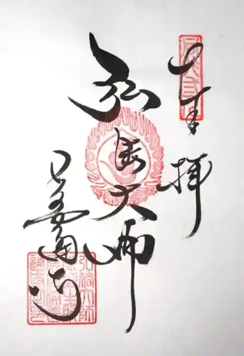 真ん中に薬師如来と書かれ、その上に梵字(薬師如来)、右上に四國第七十五番の印、真ん中に弘法大師の御手印、左下に讃岐國屏風浦善通寺の印が押されています。