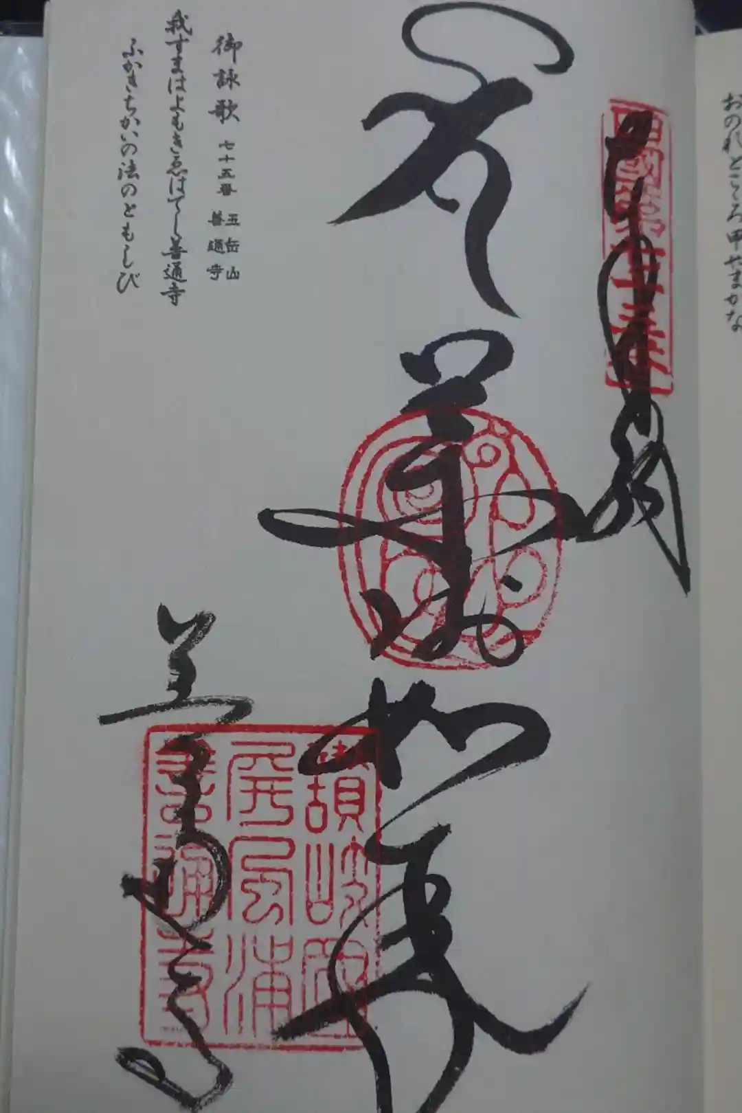 真ん中に薬師如来と書かれ、その上に梵字(薬師如来)、右上に四國第七十五番の印、真ん中に弘法大師の御手印、左下に讃岐國屏風浦善通寺の印が押されています。