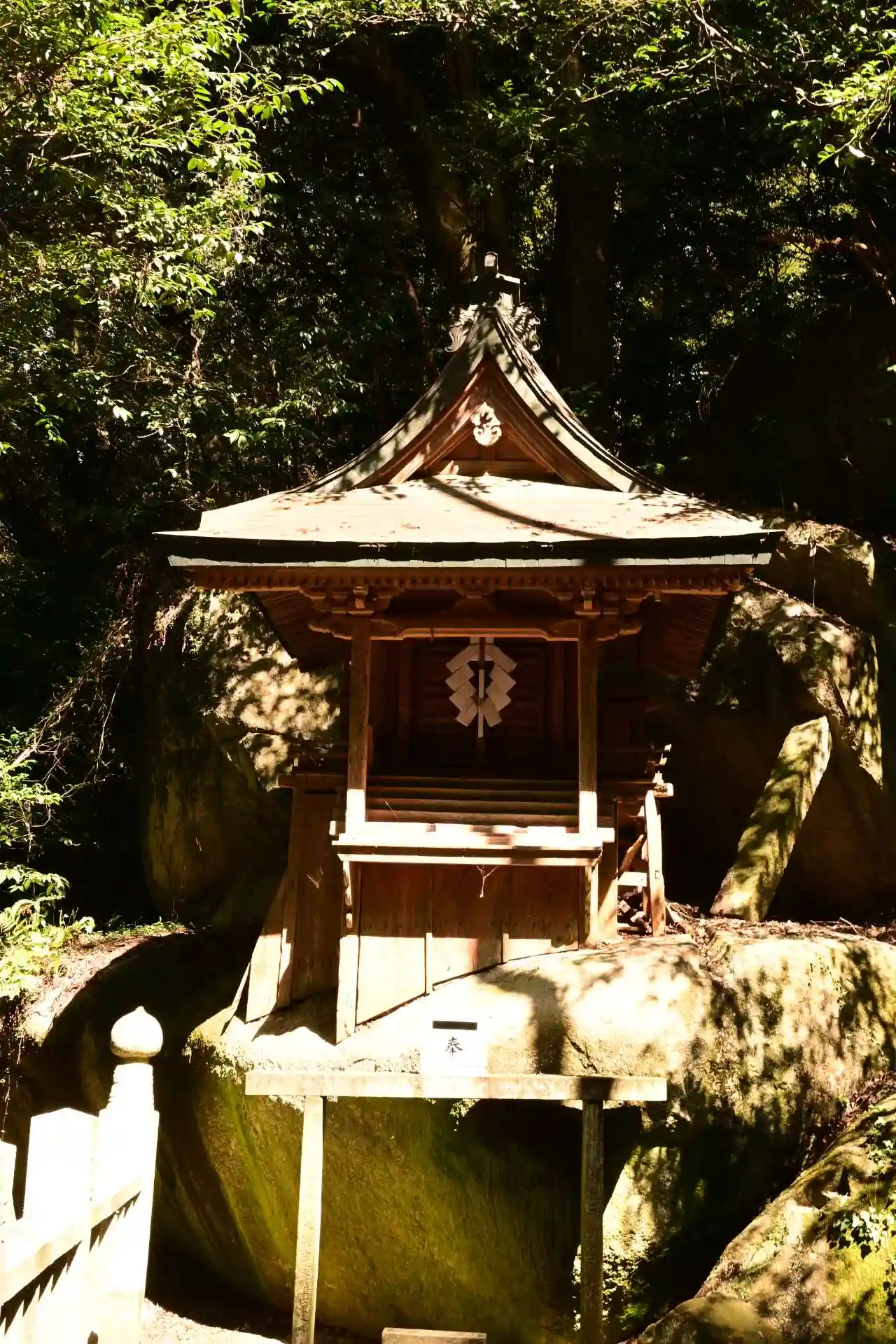 境内最奥にあります。磐座のような大岩の上に建っています。
