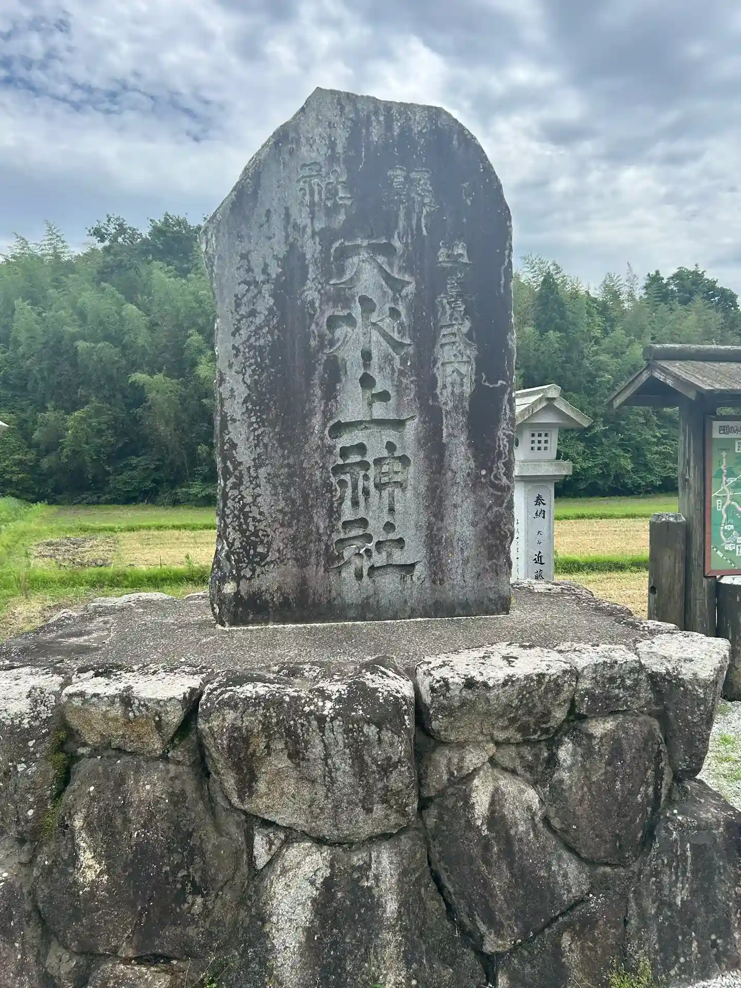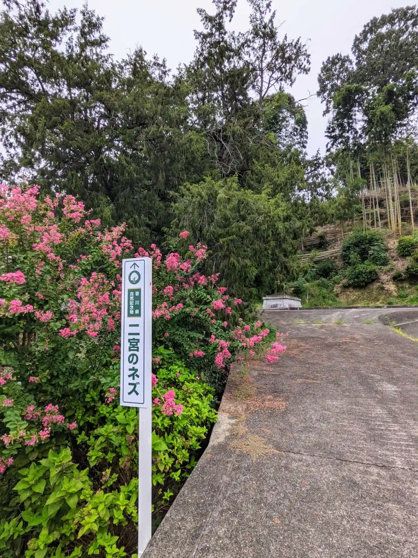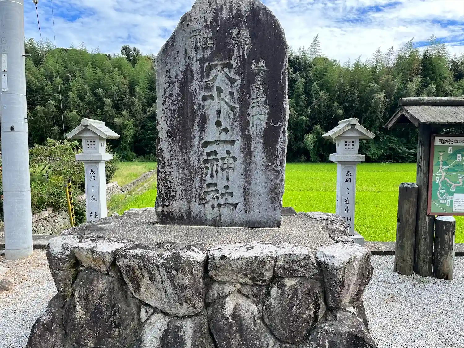 駐車場の向かいに「大水上神社」バス停、四国の道コース案内板、ネズの木の説明、社号碑