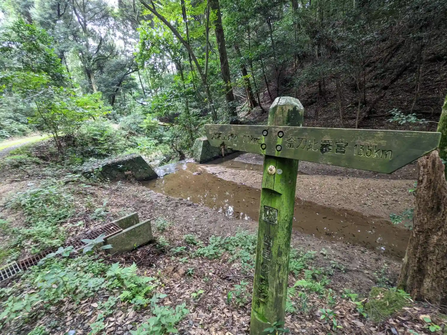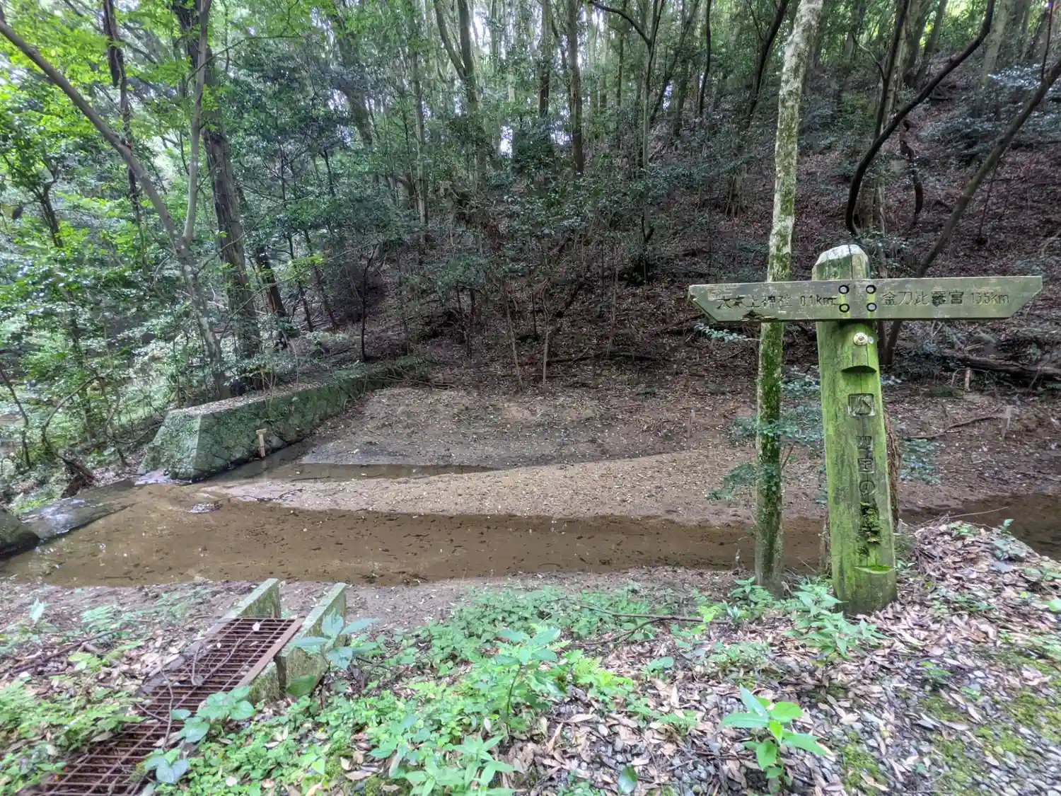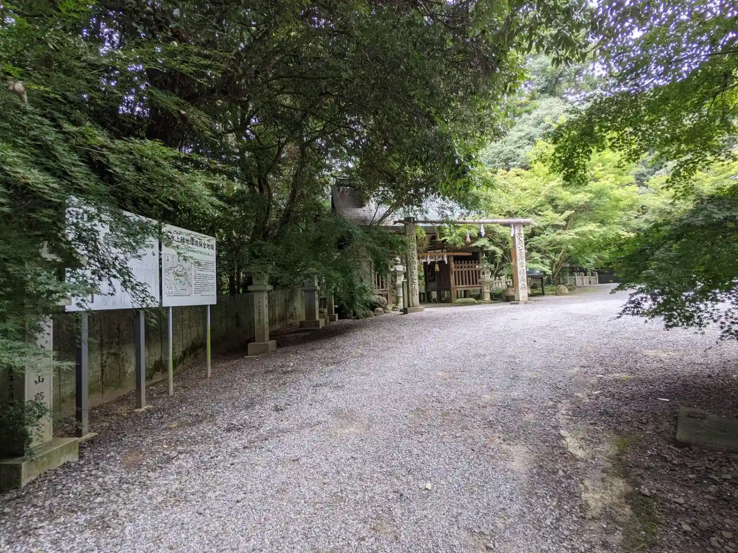 駐車場の向かいに「大水上神社」バス停、四国の道コース案内板、ネズの木の説明、社号碑