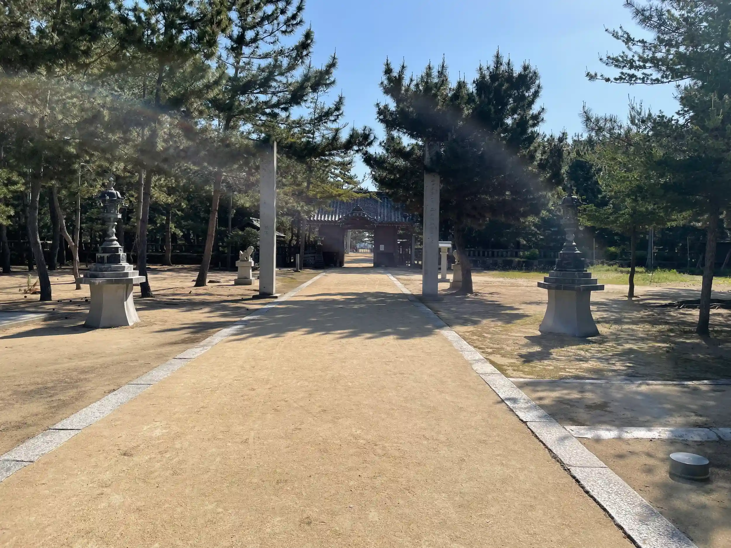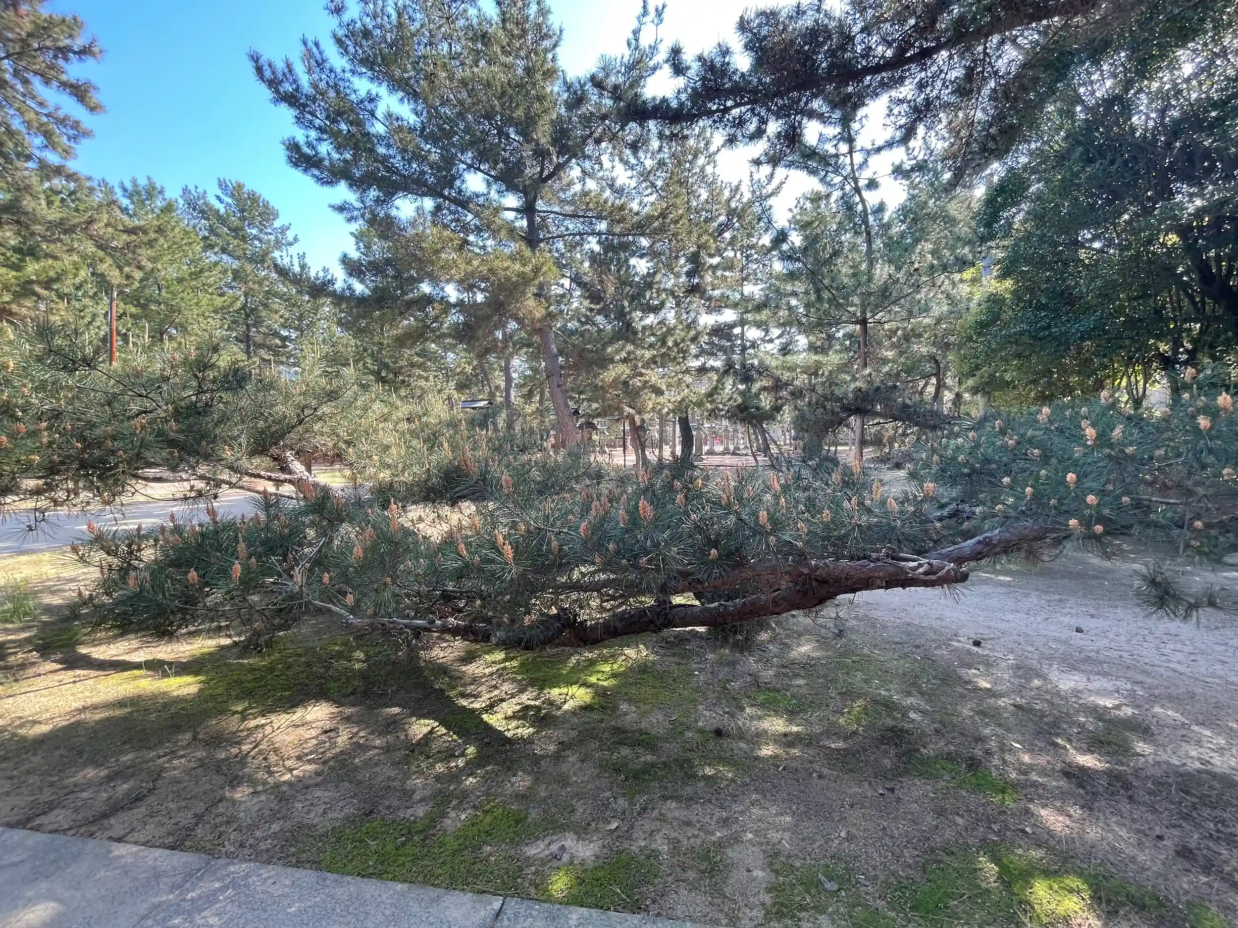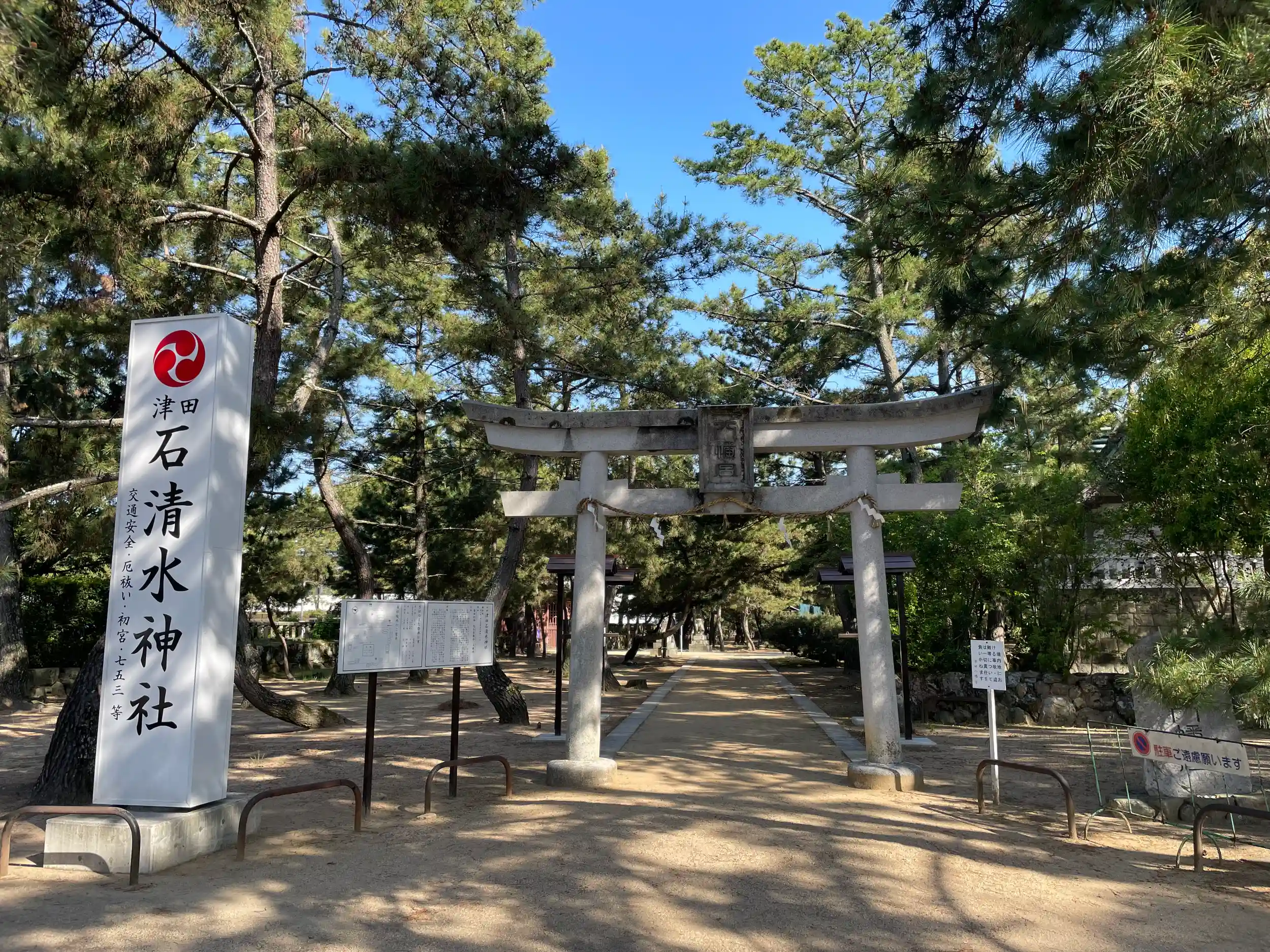 津田石清水神社とあり、側面から入ってびっくり‼️海岸近くの正門からは一直線の神道で、津田の松原と言われている場所だけに、境内は松だらけ!で日本画の絶景感、そしてとにかく広い❣️