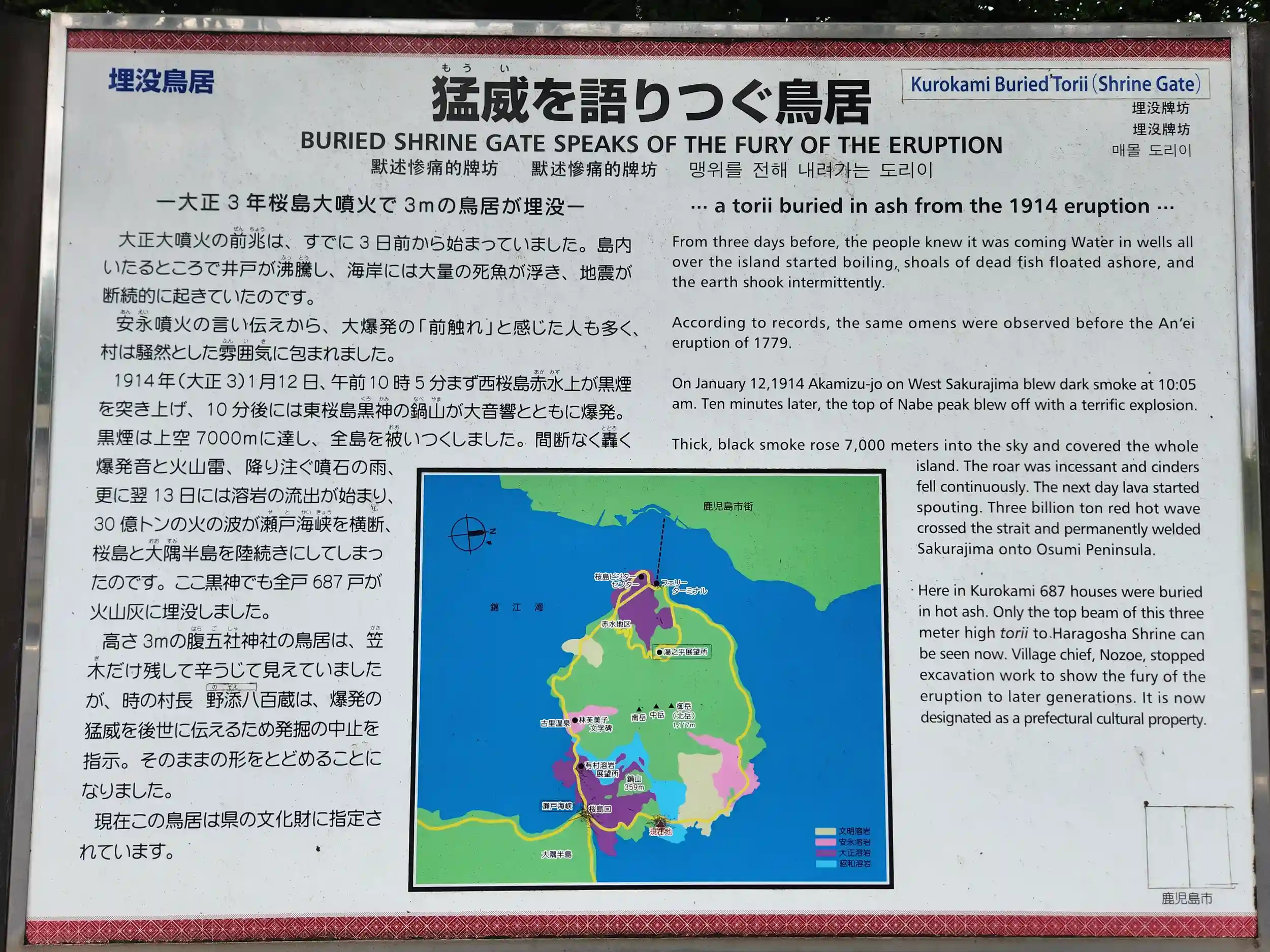 大正3年(1914年)1月の大噴火により、大量の溶岩が流出して桜島と大隅半島が陸続きとなりました。