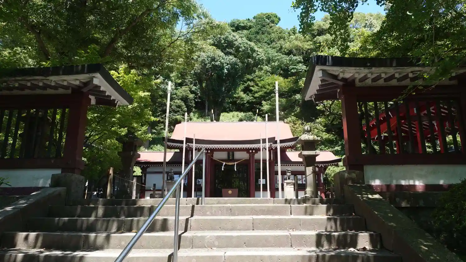 当社は、JR日豊本線・鹿児島駅の北西2kmの、市街地の中の小丘の北西麓にある。ちょうど鹿児島県護国神社の北方百数十mの位置にある。境内は広くはなく、旧県社としては相当コンパクト。境内に入ってすぐに階段を登り、その先すぐに社殿がある感じ。ただタイトな空間に年季の入った構造物や植物などいろんなものがあって見て廻るには楽しい空間になっている。
