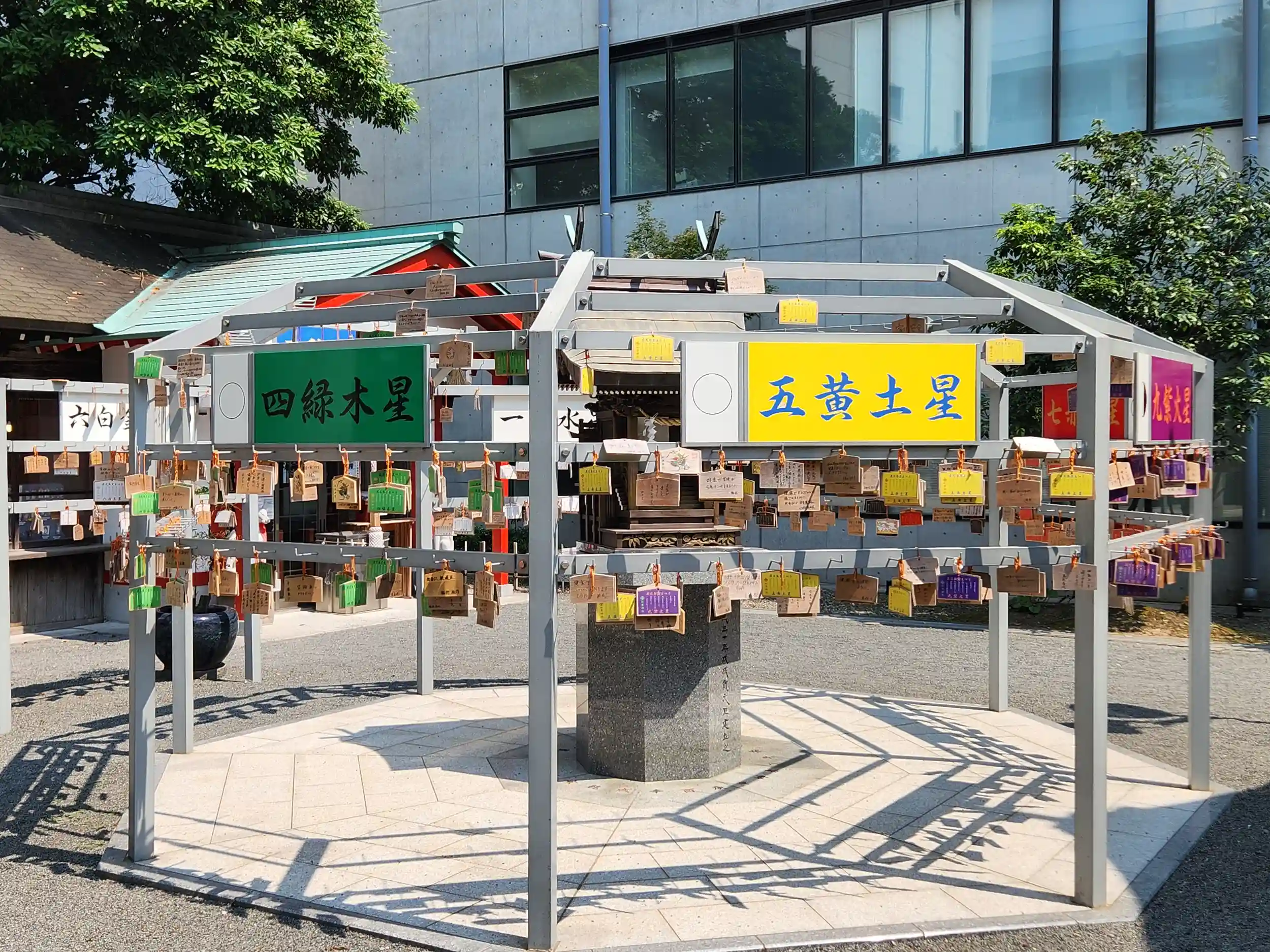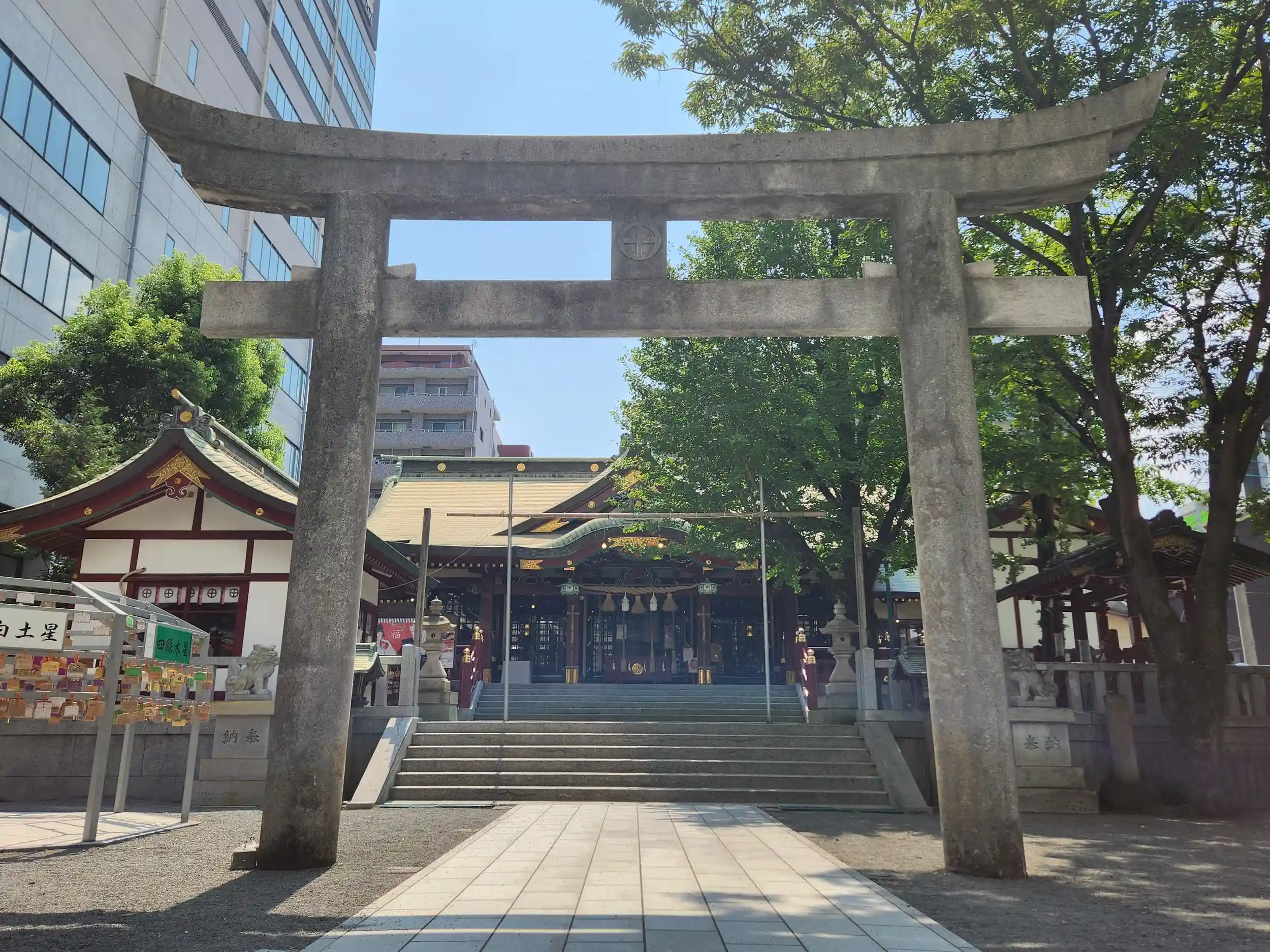 どうも本来の参道は東側からまっすぐ拝殿に向かっていたようなのですが、境内のすぐ東には現在ビルが建っており、そこが参道だった名残として境内からビルを挟んだ東側に旧鳥居が残されているようです。