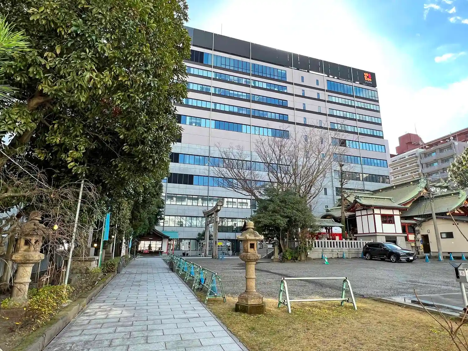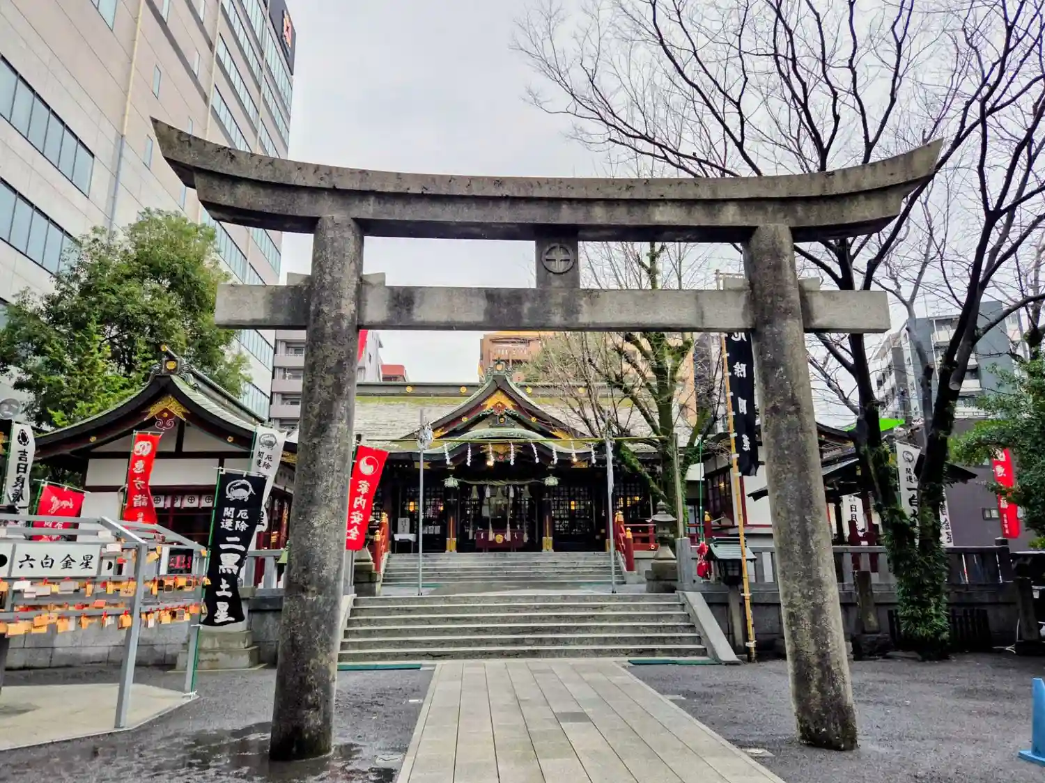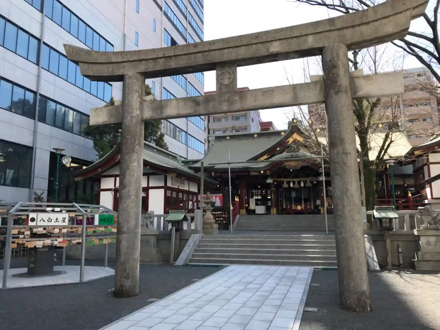 拝殿から振り返って境内全景。(後ろに見える大きなビルはNTT。)