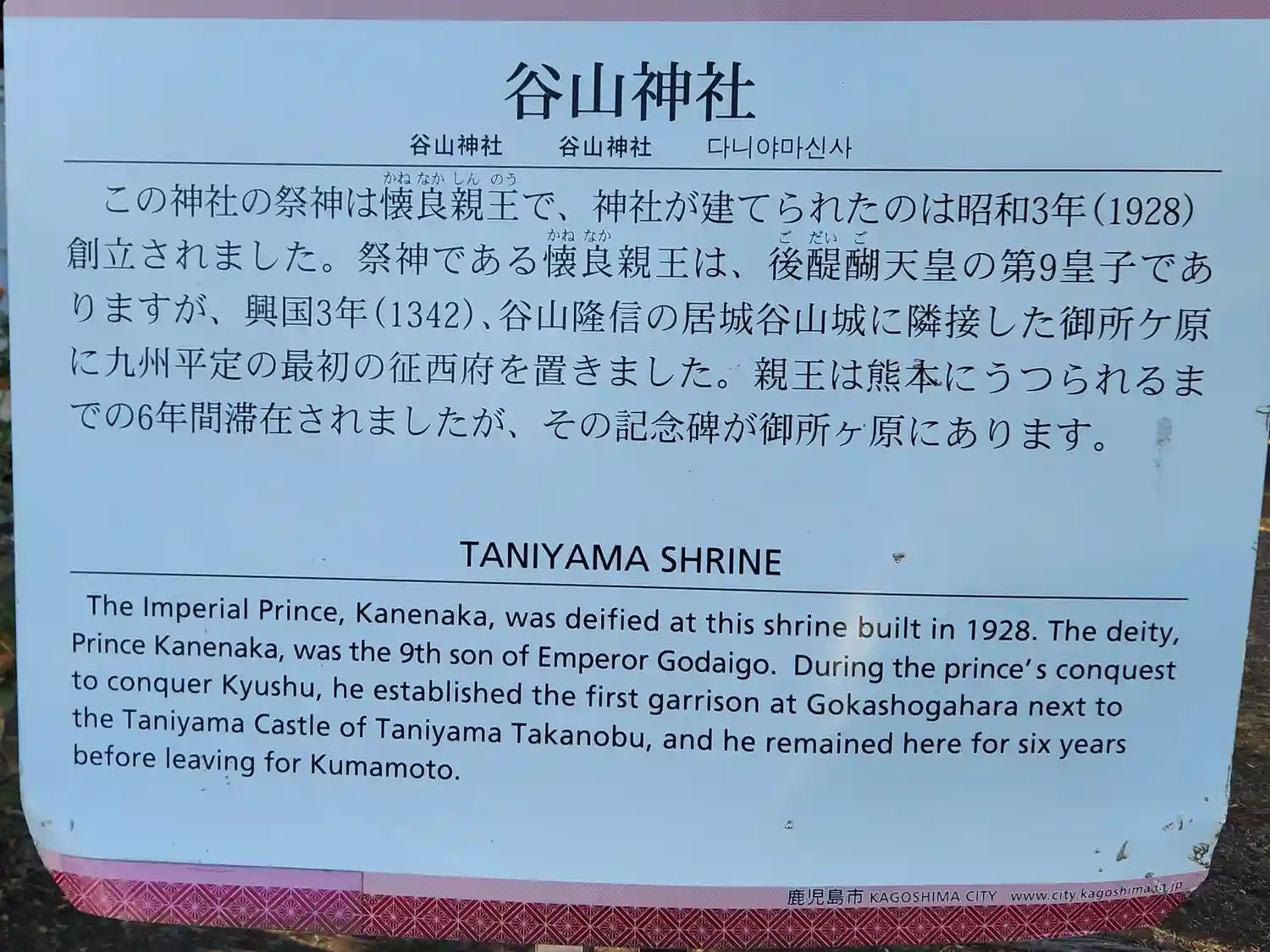 | ご由緒 | 足利尊氏とともに鎌倉幕府を倒した後醍醐天皇ごだいごてんのうの皇子である谷山神社ご祭神懐良親王かねながしんのうは、西暦1336年(延元元年)、後醍醐天皇の命により、鎮西ちんせい(九州)統一のため征西大将軍に任命された。 西暦1342年(興国3年)5月、谷山城主 谷山五郎隆信たにやまごろうたかのぶは懐良親王を千々輪ちちわ本城(谷山城)に迎えて本城より約20町(2,200メートル)の高台に御所ごしょを建て衷心ちゅうしんをよりこれを奉迎ほうげいしたこの地を御所ヶ原ごしょがはらと呼び、現在親王の石碑が建っている。 昭和3年谷山町民は懐良親王の英霊を慰め奉り、また神徳を宣揚(せんよう)して国民の道徳の涵養(かんよう)に努めようとして、谷山神社を建立した。谷山神社建立にあたっては、明治時代に2度内閣総理大臣を務めた鹿児島出身の松方正義まが尽力した。 |