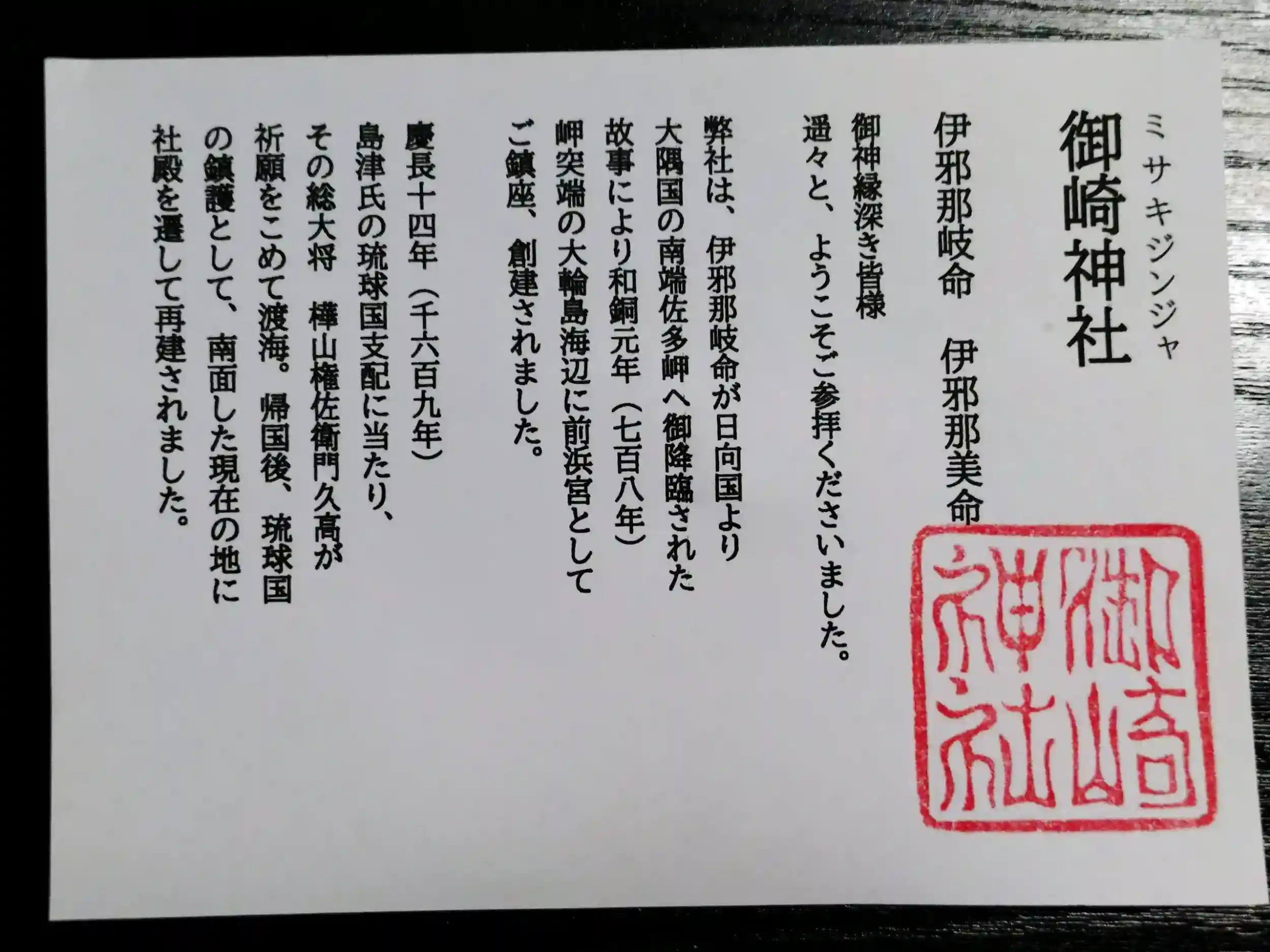 『御崎神社』は1609年(慶長14年)島津氏琉球出兵の際帰国の後、琉球国の鎮護として火尾の地より現在地に遷して再建したという。そのため社殿が南向きで海側から参道が伸びている。