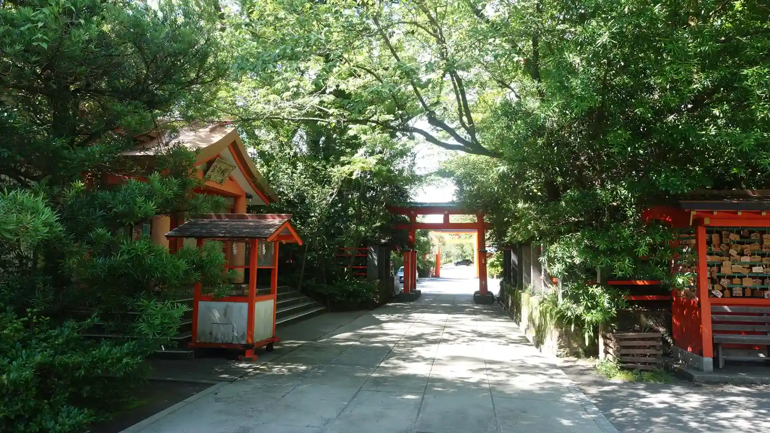 静かな場所で、境内に入ると木々の緑と朱塗りの本…