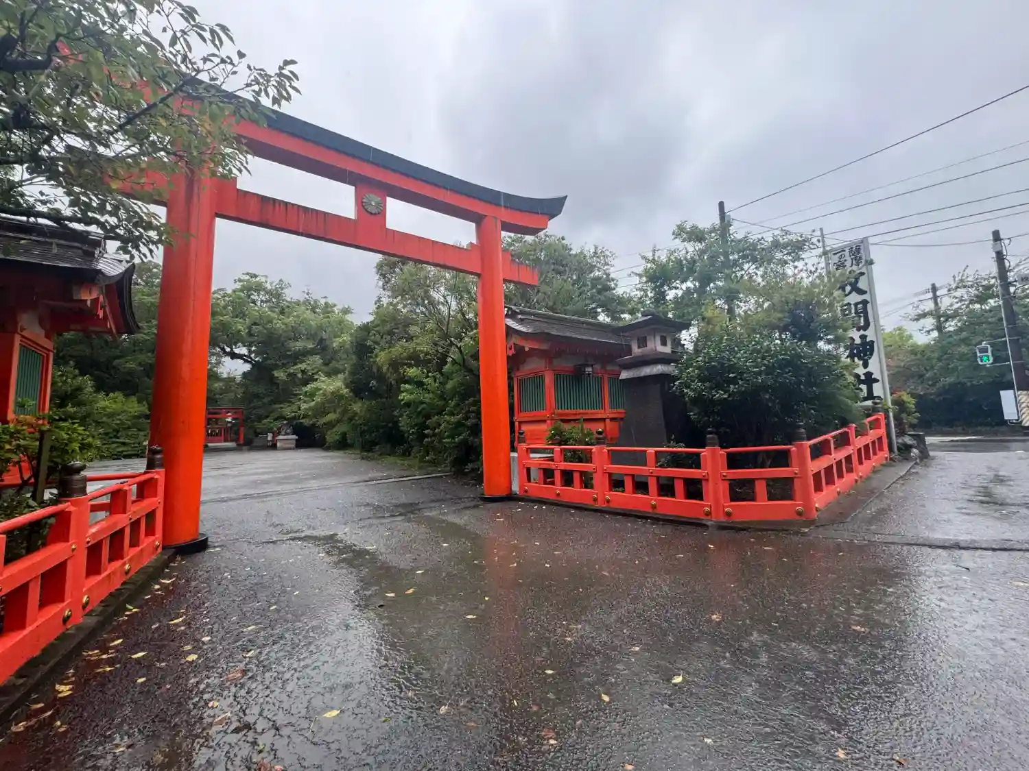 境内北端入口全景。写真右端は県道28号線の枚聞神社前交差点。