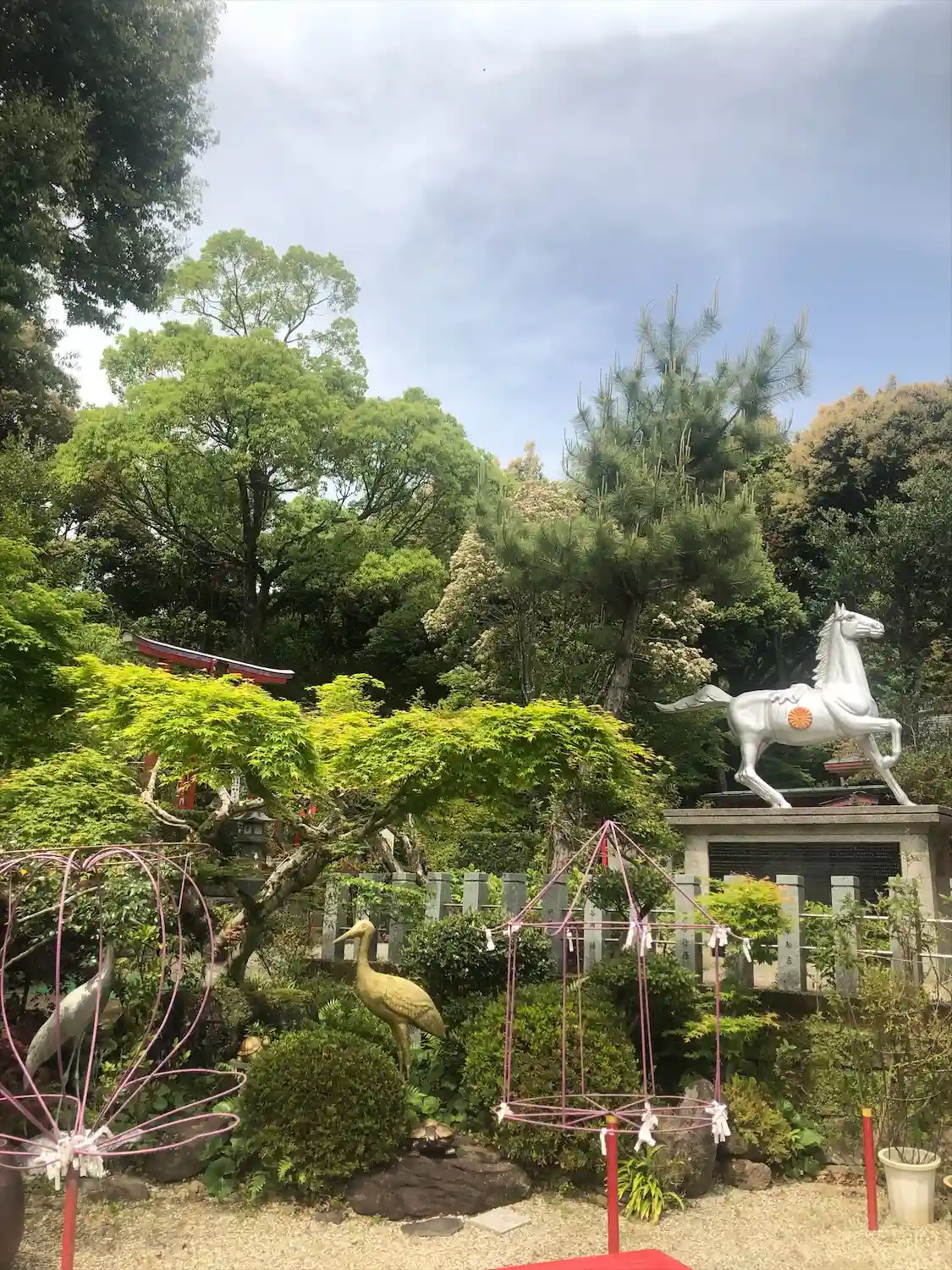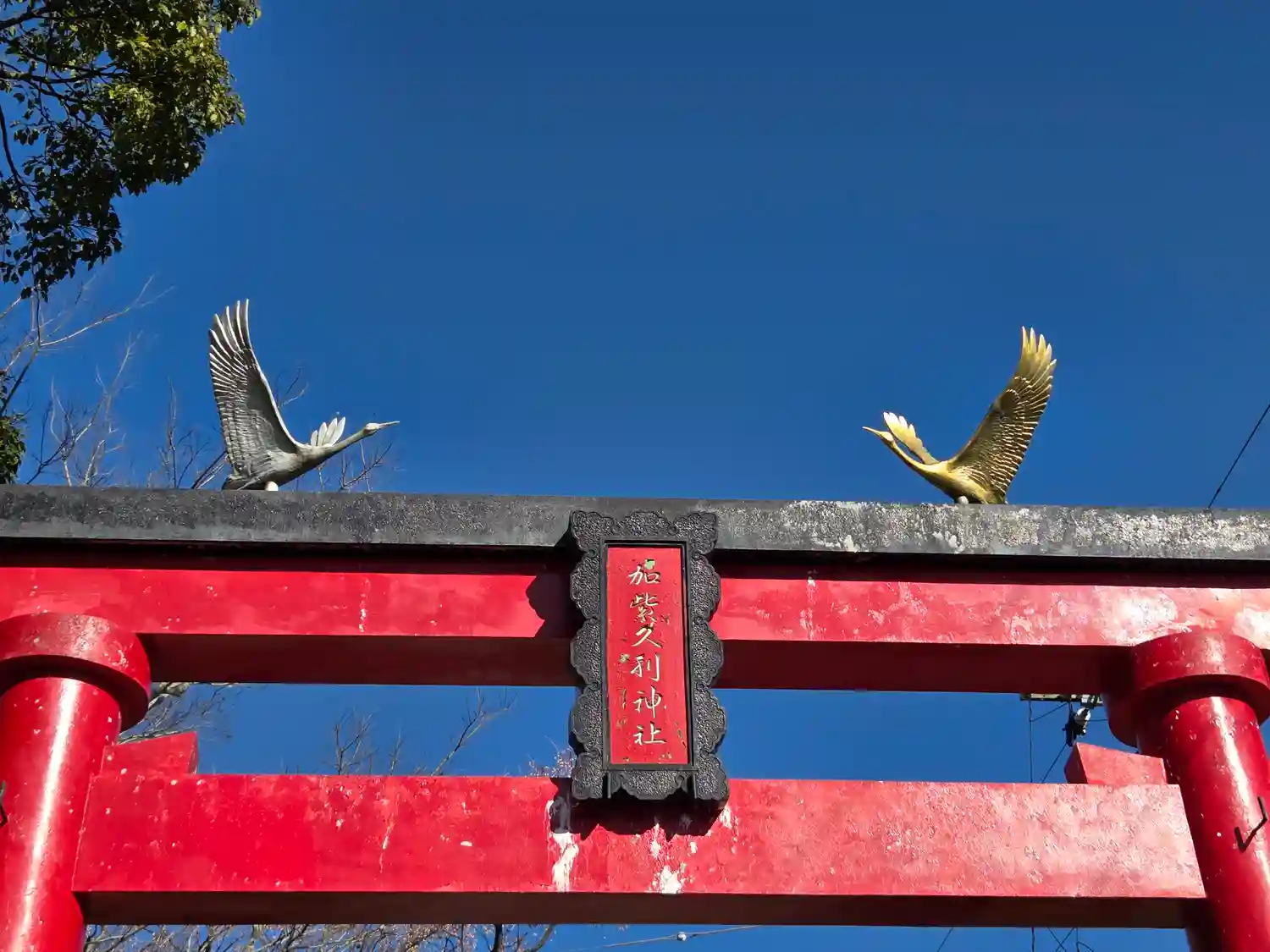 鳥居の上には金・銀の鶴が止まっています