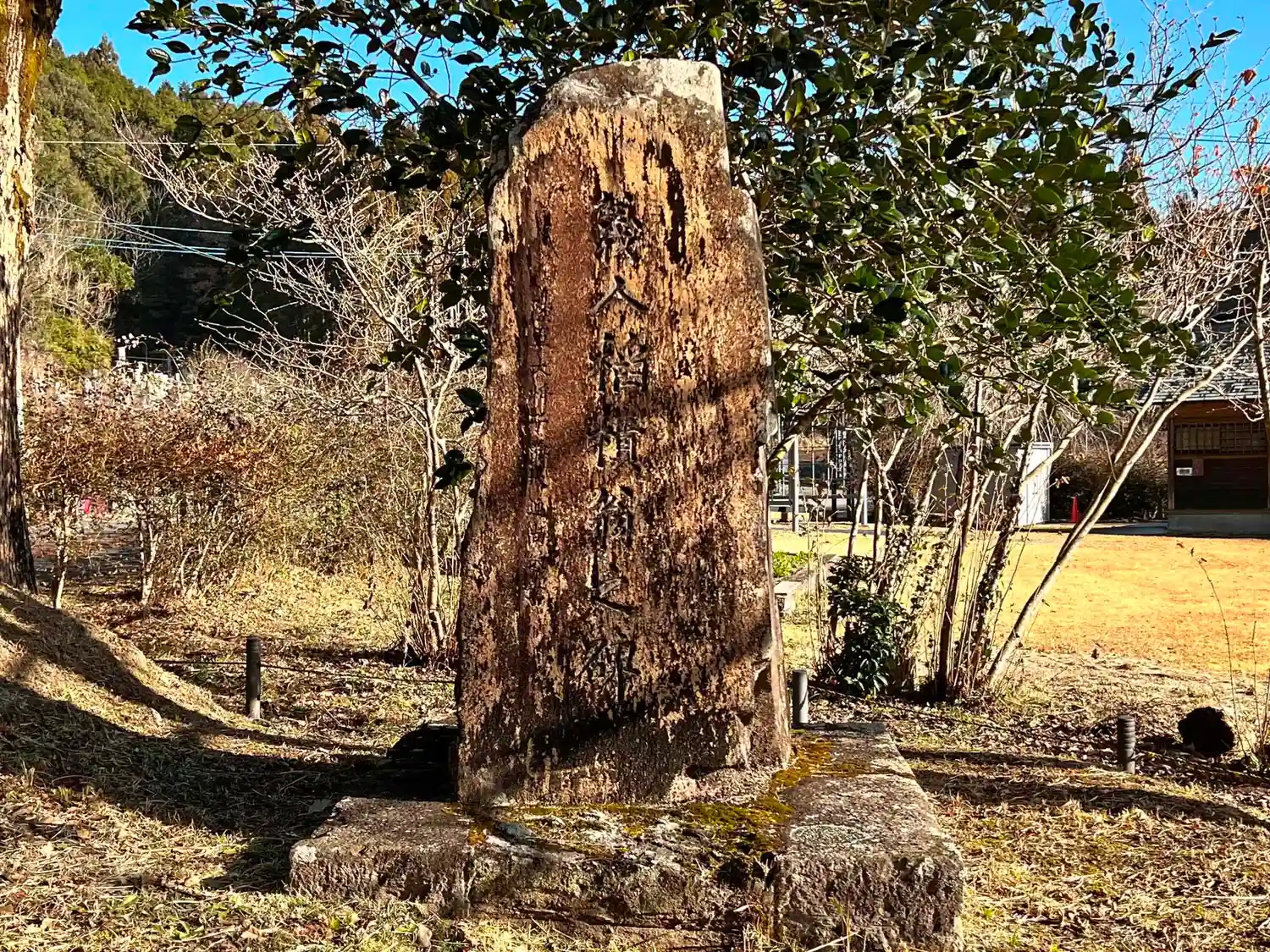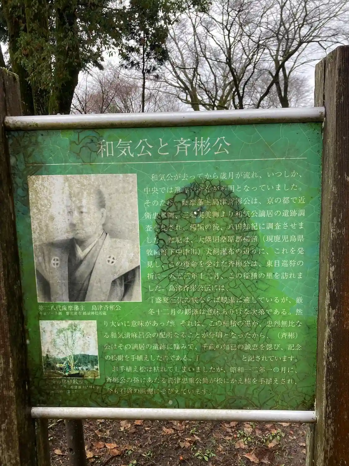 こちらは<忠烈和気公之遺跡>。もともとこの碑の傍に、1853年に斉彬公お手植えの松があったが枯れ、その後1937年に孫の島津忠重侯爵がお手植えした楠の木が立っている。