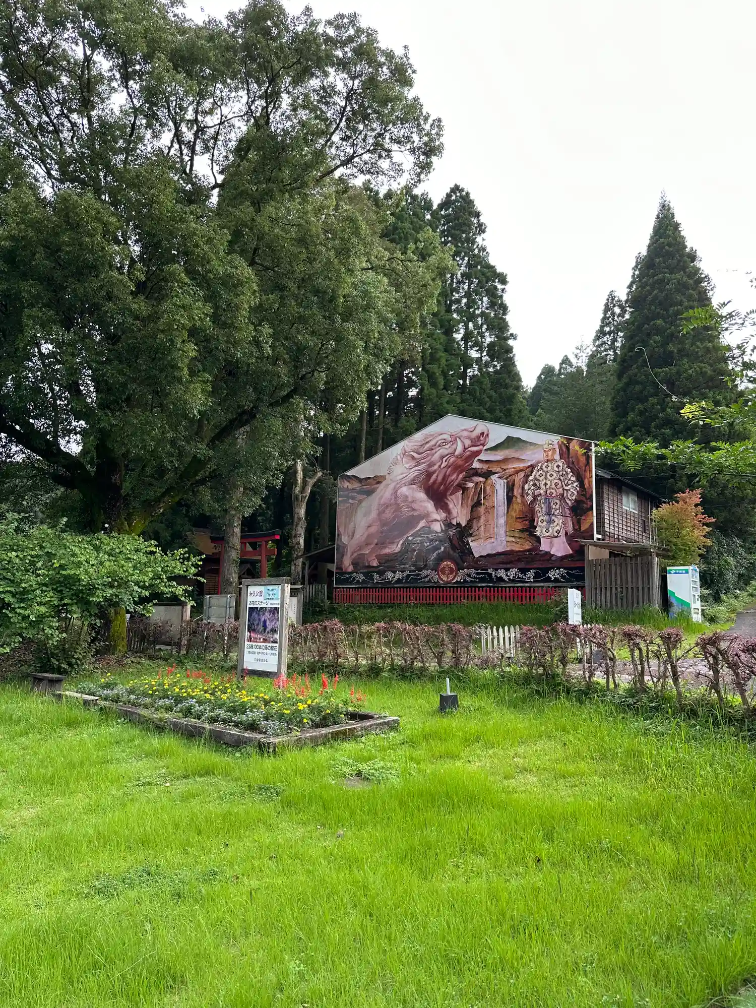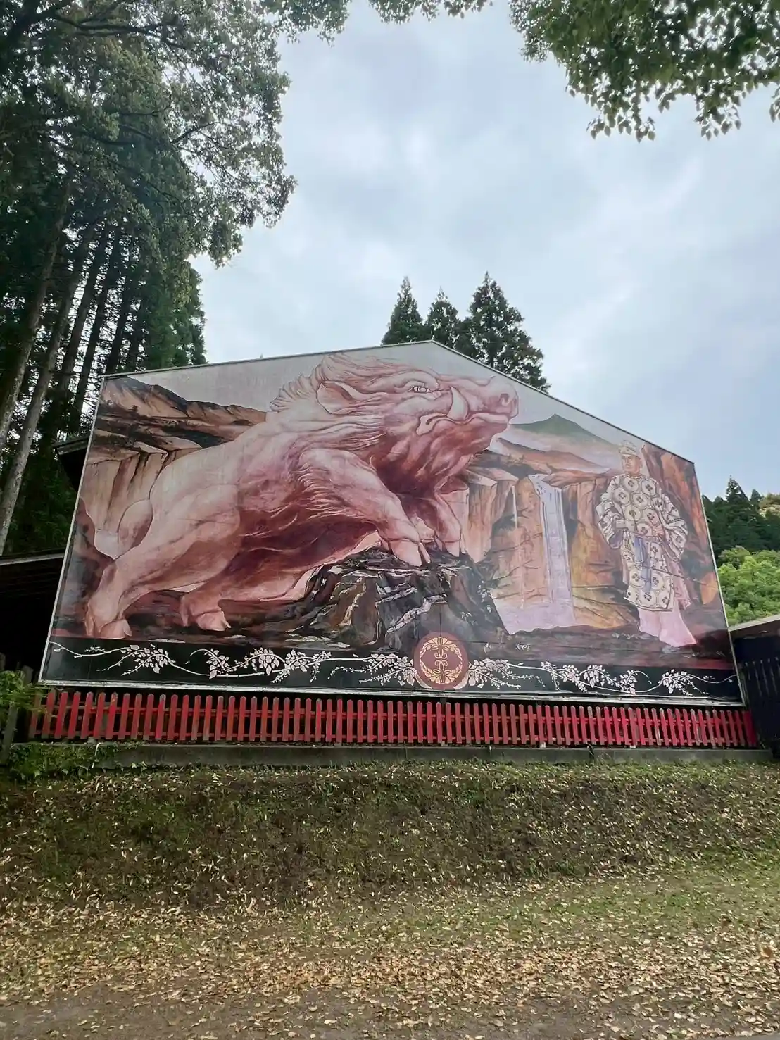 境内入口の右側にある巨大な絵馬。縱8.3m、横12.5mあり、2007年(平成19年)の亥年に製作された。和気清麻呂公とイノシシが描かれているが、イノシシは、和気公を危機から救い大隅國まで導いたと伝わる。