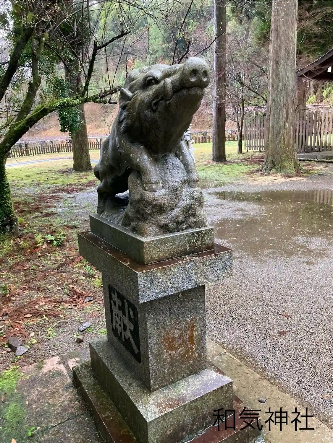 和気の清麻呂公がイノシシに助けられたということに因み、狛犬ではなく狛猪が鎮座している。