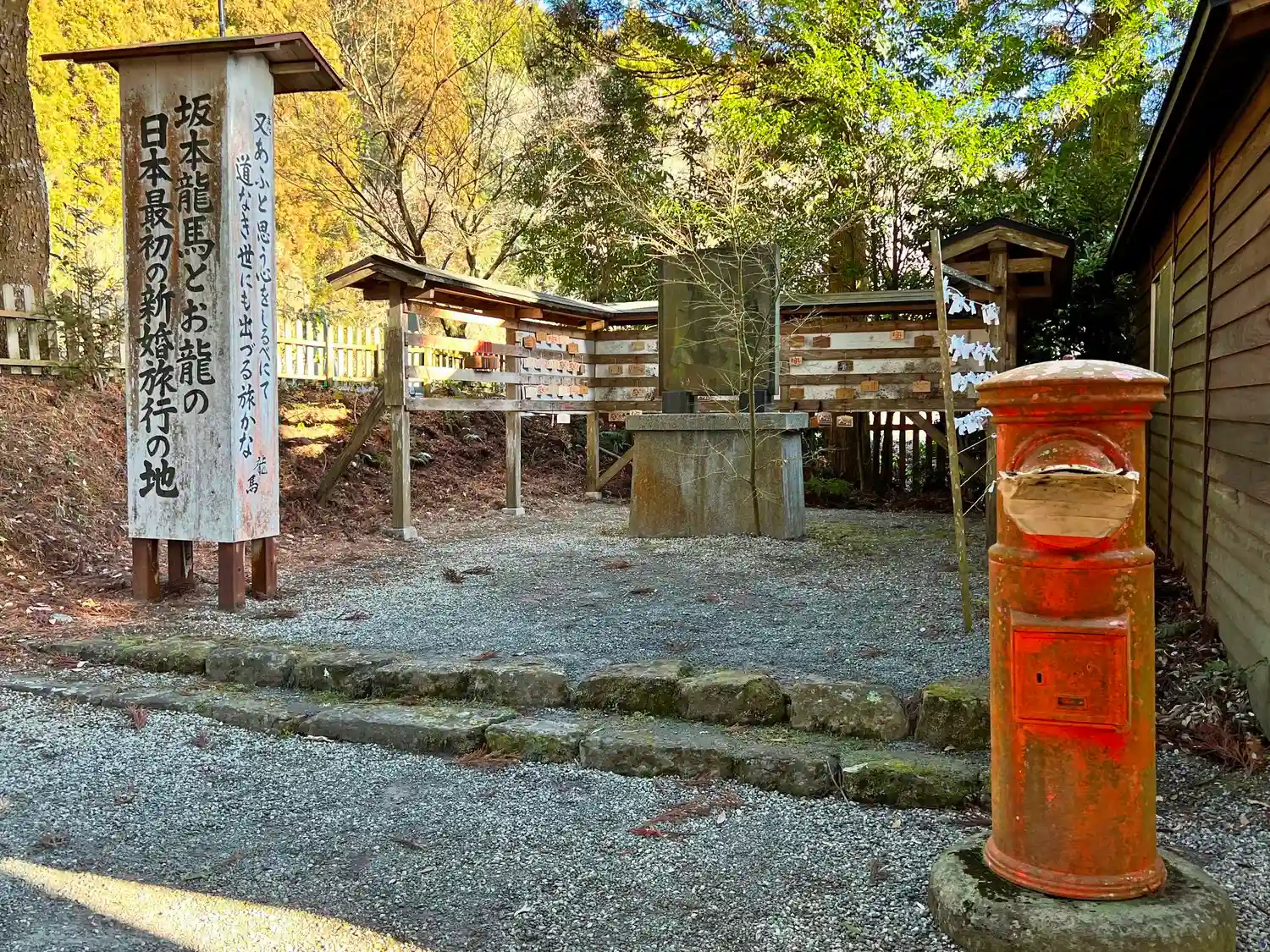 参道右側、社務所の隣にある絵馬掛けゾーン。「坂本龍馬とお龍の新婚旅行の地」の看板があるが、1866年に坂本龍馬が当地を訪問したとされ、その時の和歌が記載されている。