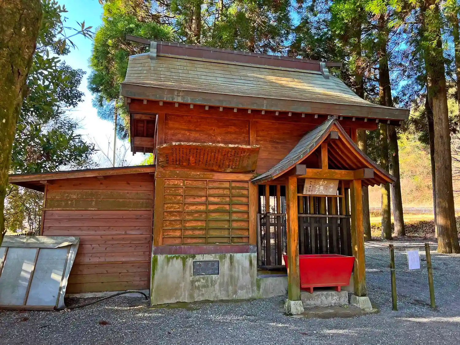 参道左側にある<和気ちゃん>の建物。白いイノシシが飼育されていたが、数年前に亡くなっている。