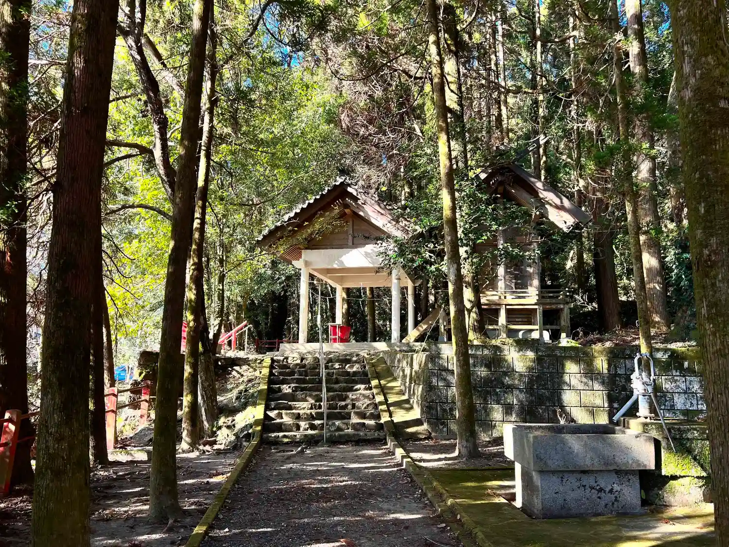 参道右側の<手水盤>。井戸の汲揚げポンプがいい味を出している。(o^―^o)
