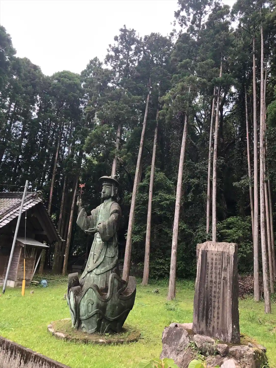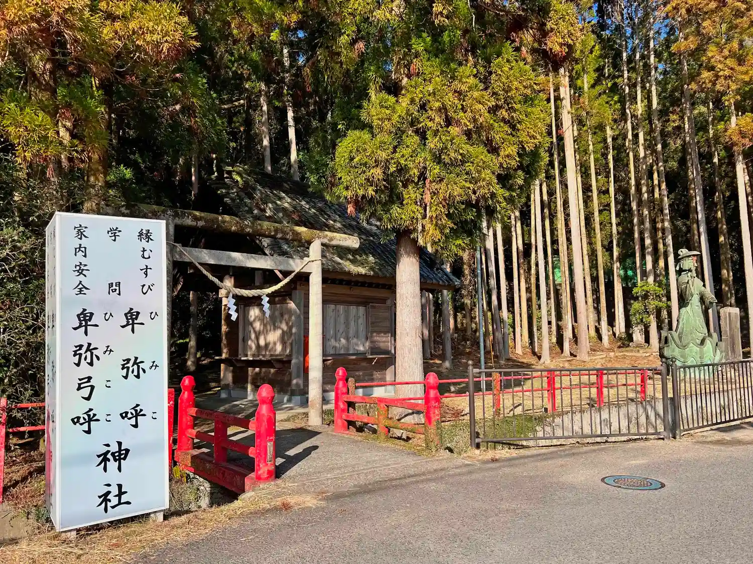 左側の看板が当社<卑弥呼神社>。写真右手には何やら青銅像が立っている。