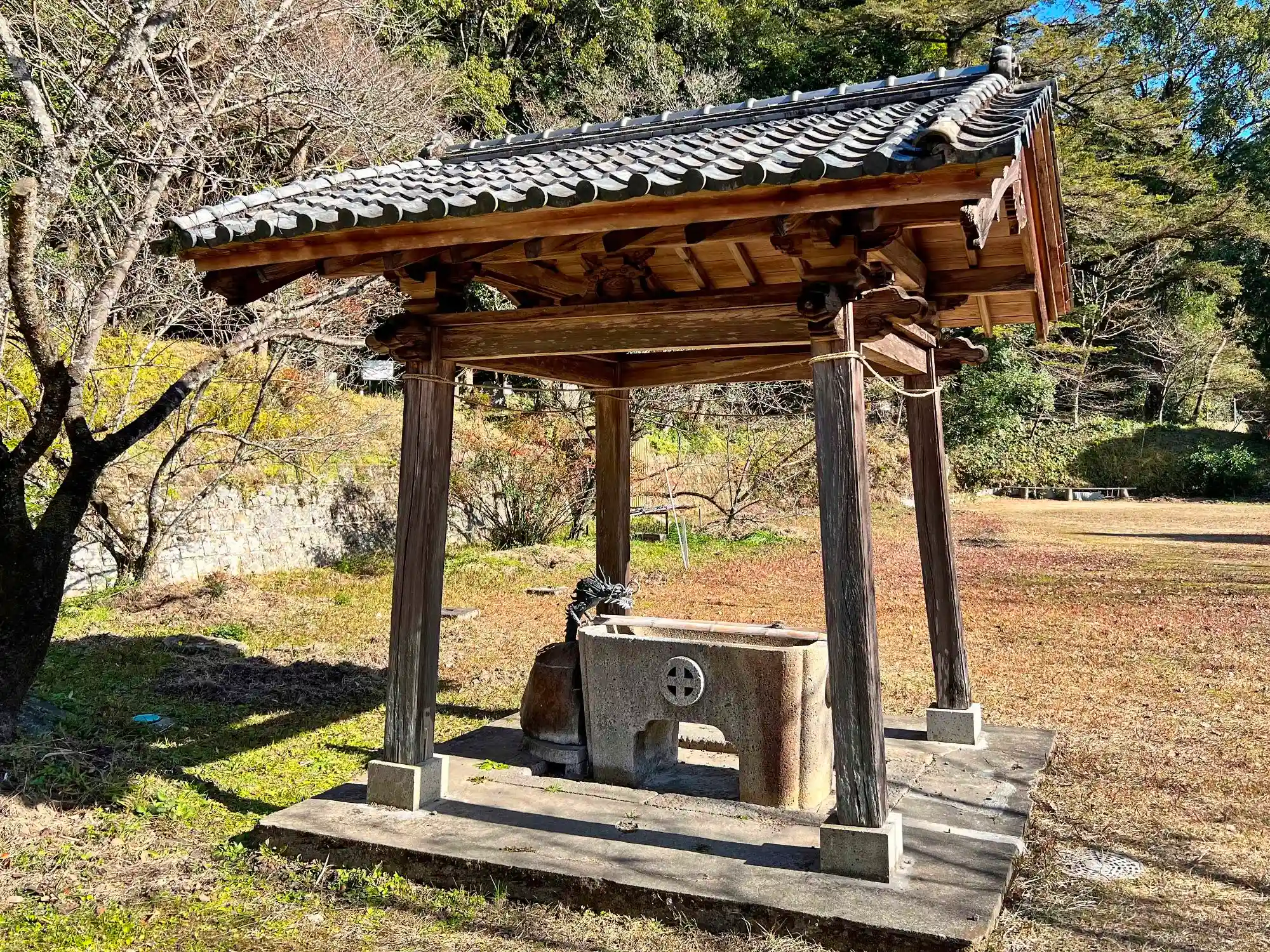 参道右手にある<手水舎>。手水盤には島津家の家紋「丸に十字」。