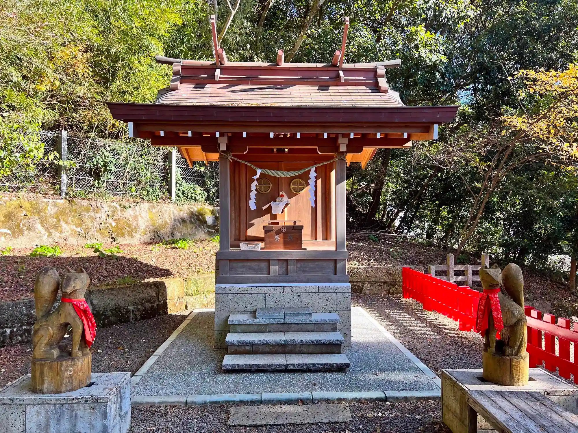 社殿前両側に立つ<狛狐>は珍しい木製で、赤いスカーフを纏って可愛らしい。