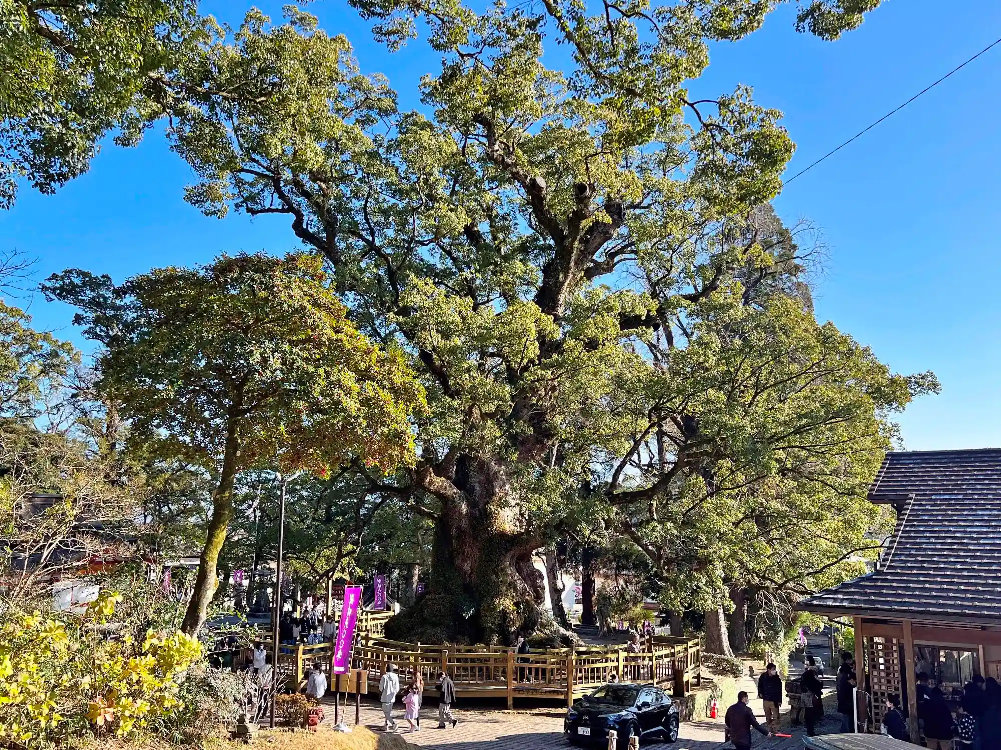 根元近くを通る人々や小型SUVと大きさを比べると、クスの太さが相当ヤバいことが分かる。