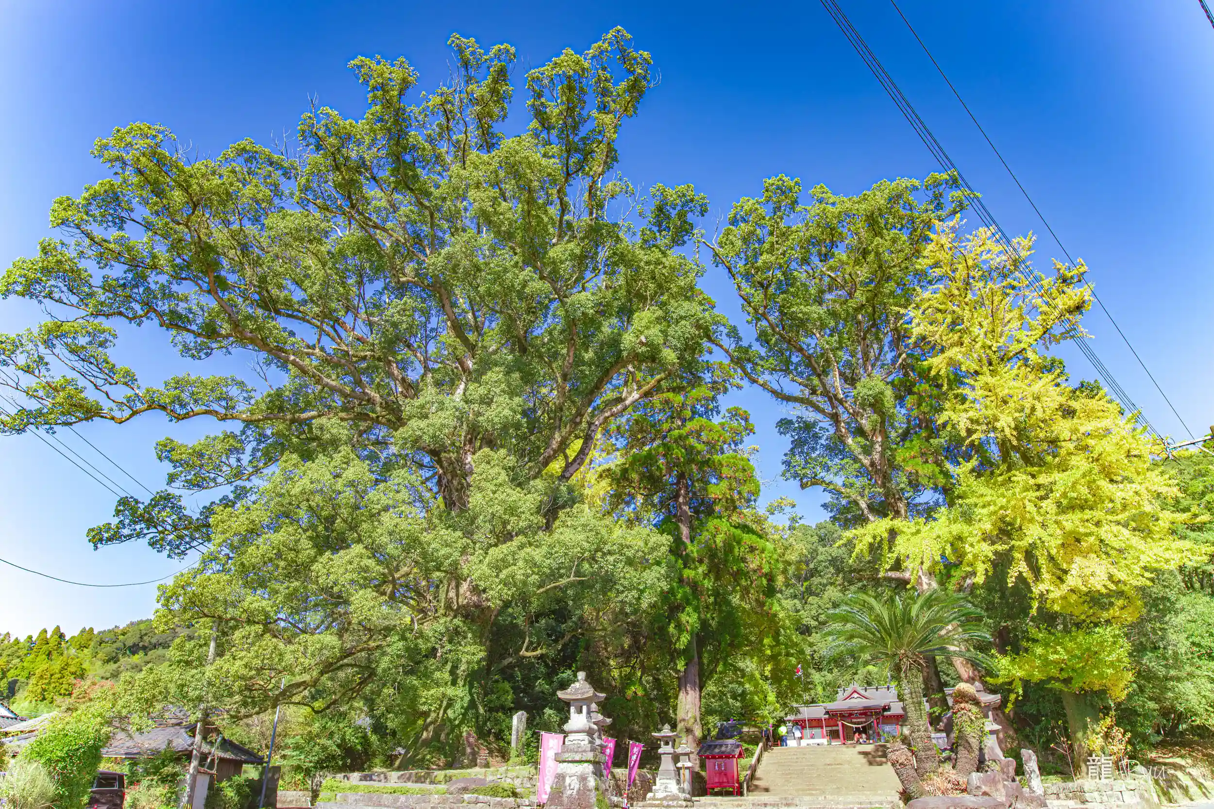 境内にあるクスノキは「蒲生の大クス」と親しまれ、樹齢約1,600年で、目通り幹囲24.22メートル、根回り33.5メートル、高さ約30メートルと日本一の巨樹とされています。