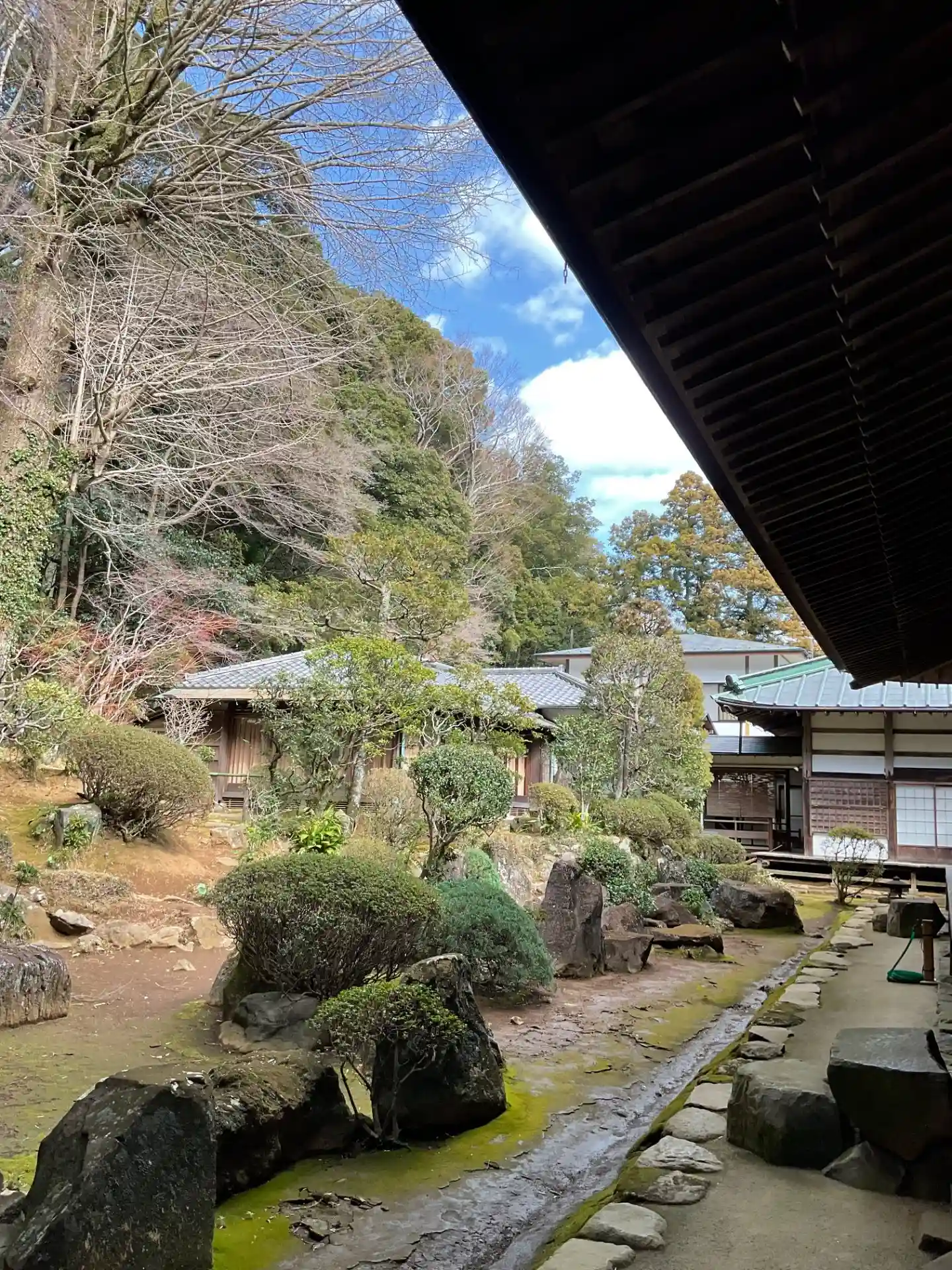 本堂裏手の枯山水の庭園。高台の上に立っているのは「開山堂」です。