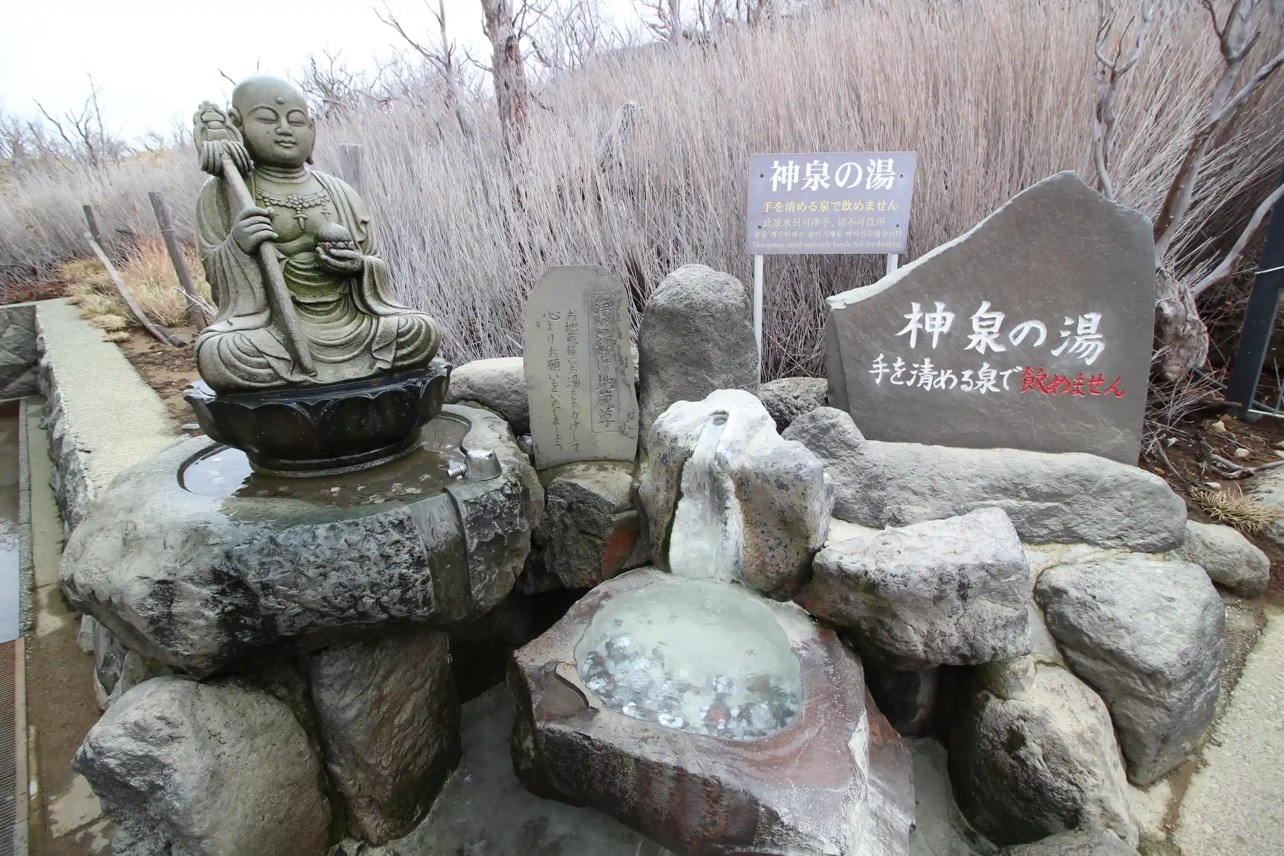 大涌谷噴煙地の手前にある延命地蔵尊😊温かい泉「神泉の湯✨」が湧き、そばに湯かけ地蔵があります。名物の黒たまごは1個食べると7年寿命が延びると言われています❗️温かい温泉たまご💓美味しくいただきました😋