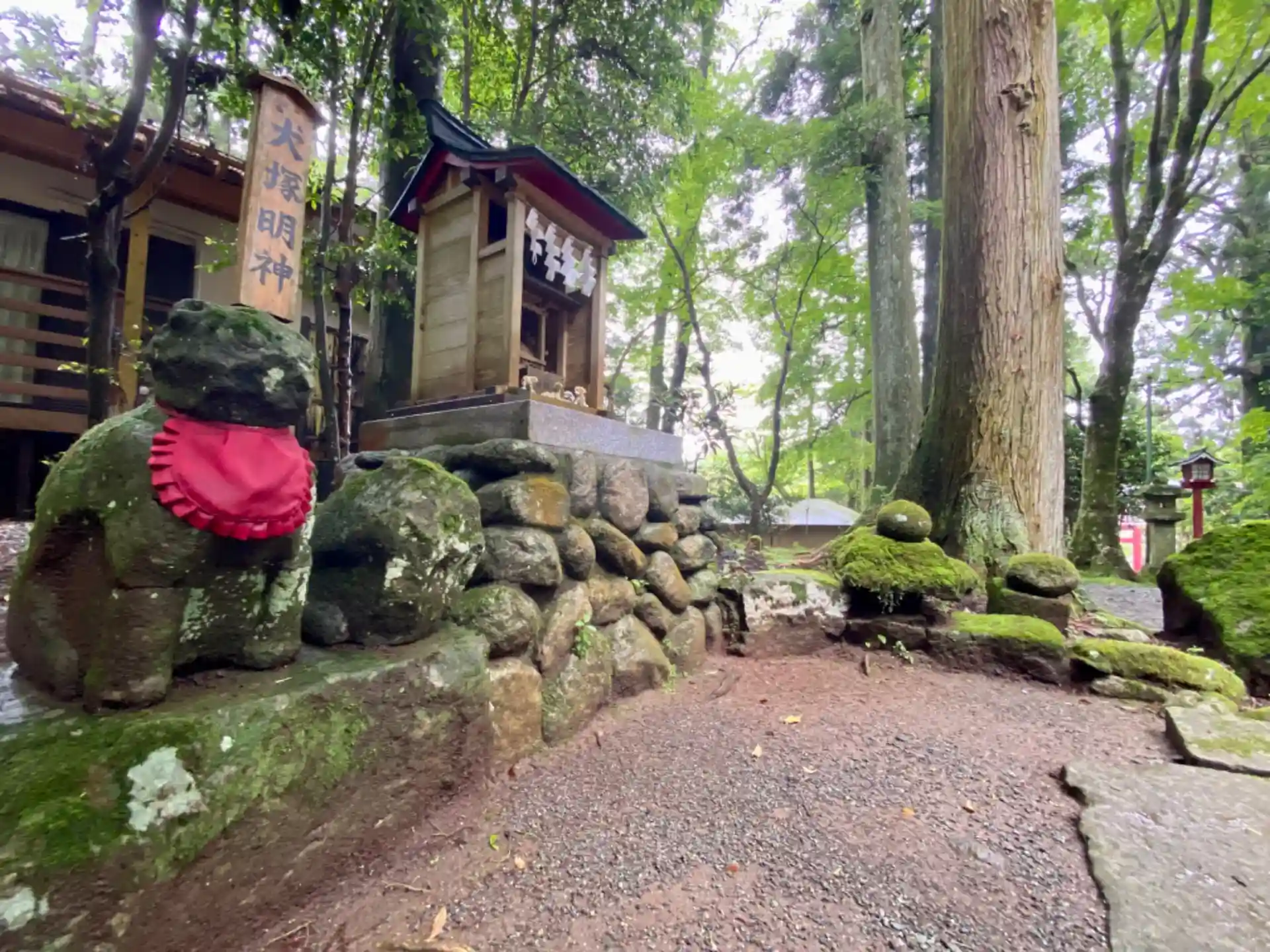 元和4年(1618)箱根宿が創設された時、付近にはたくさんの狼がいて、建設中の宿の人々を悩ませていたそうです。そこで唐犬2匹を手に入れて狼を退治させ、やっと宿場が完成しました。だけど2匹の唐犬も傷付いて死んでしまいました。宿場を完成させてくれた2匹の唐犬をここに埋め、「犬塚明神」と崇め祀られました。