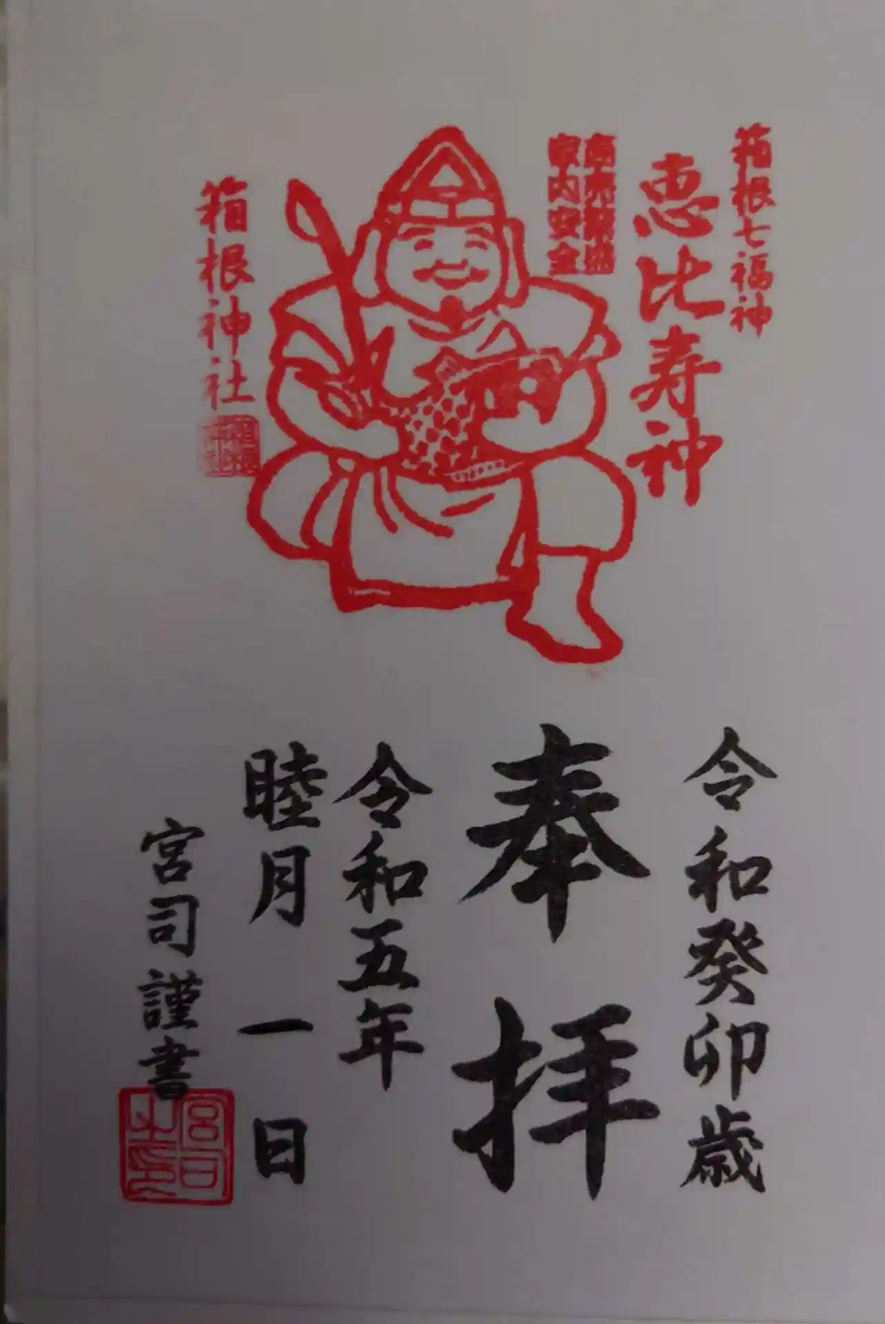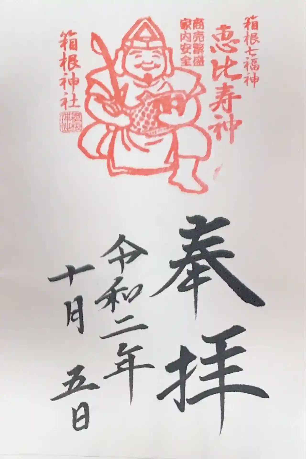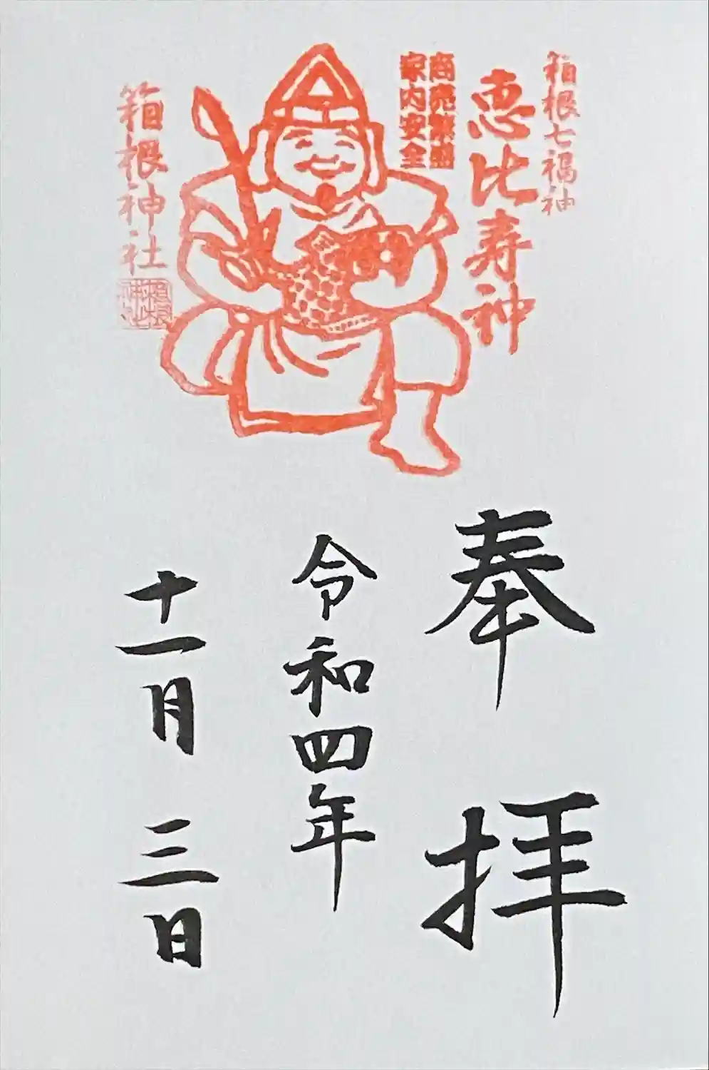 箱根神社を参拝し、箱根神社、恵比寿様の御朱印を頂きました。