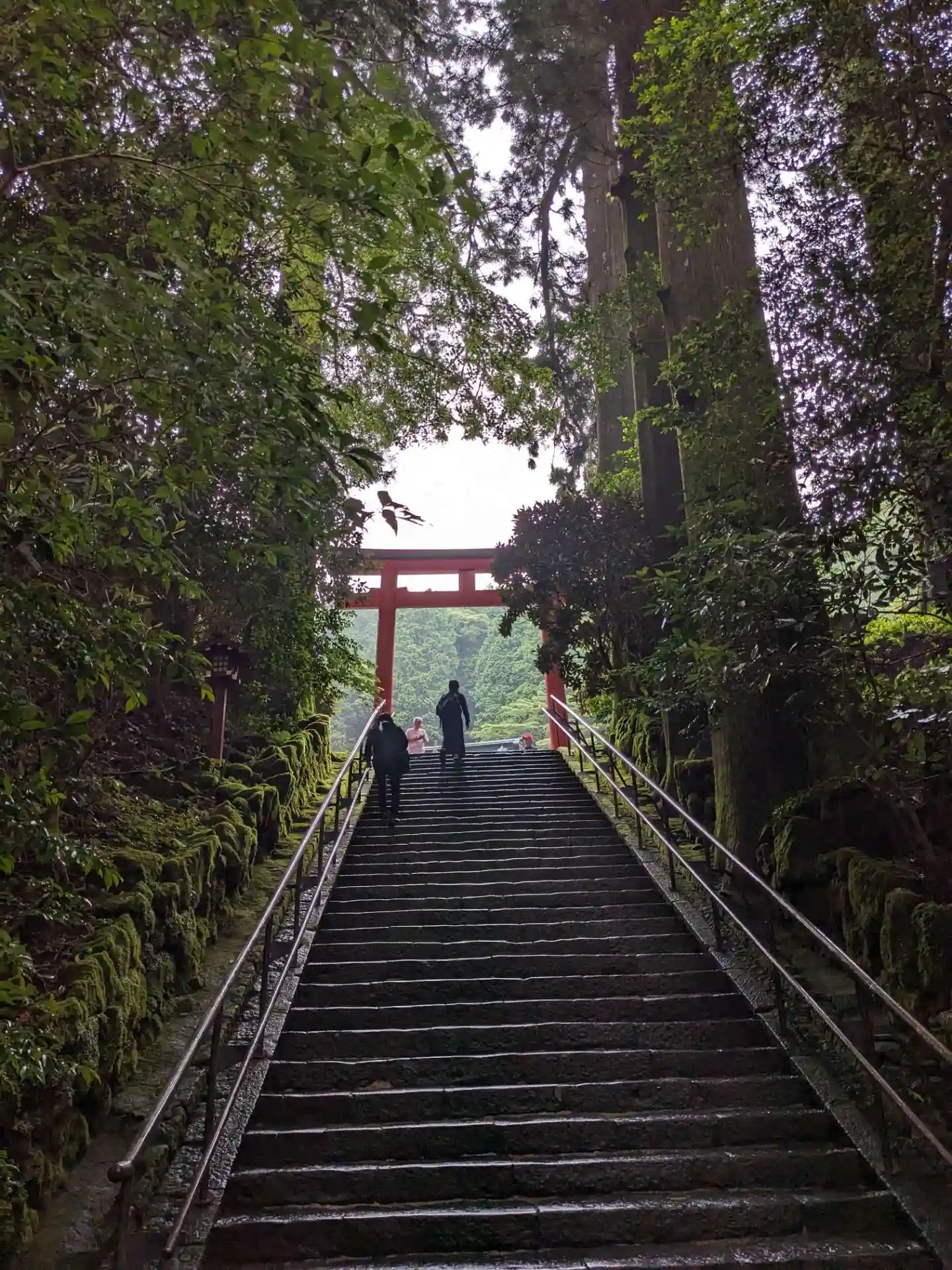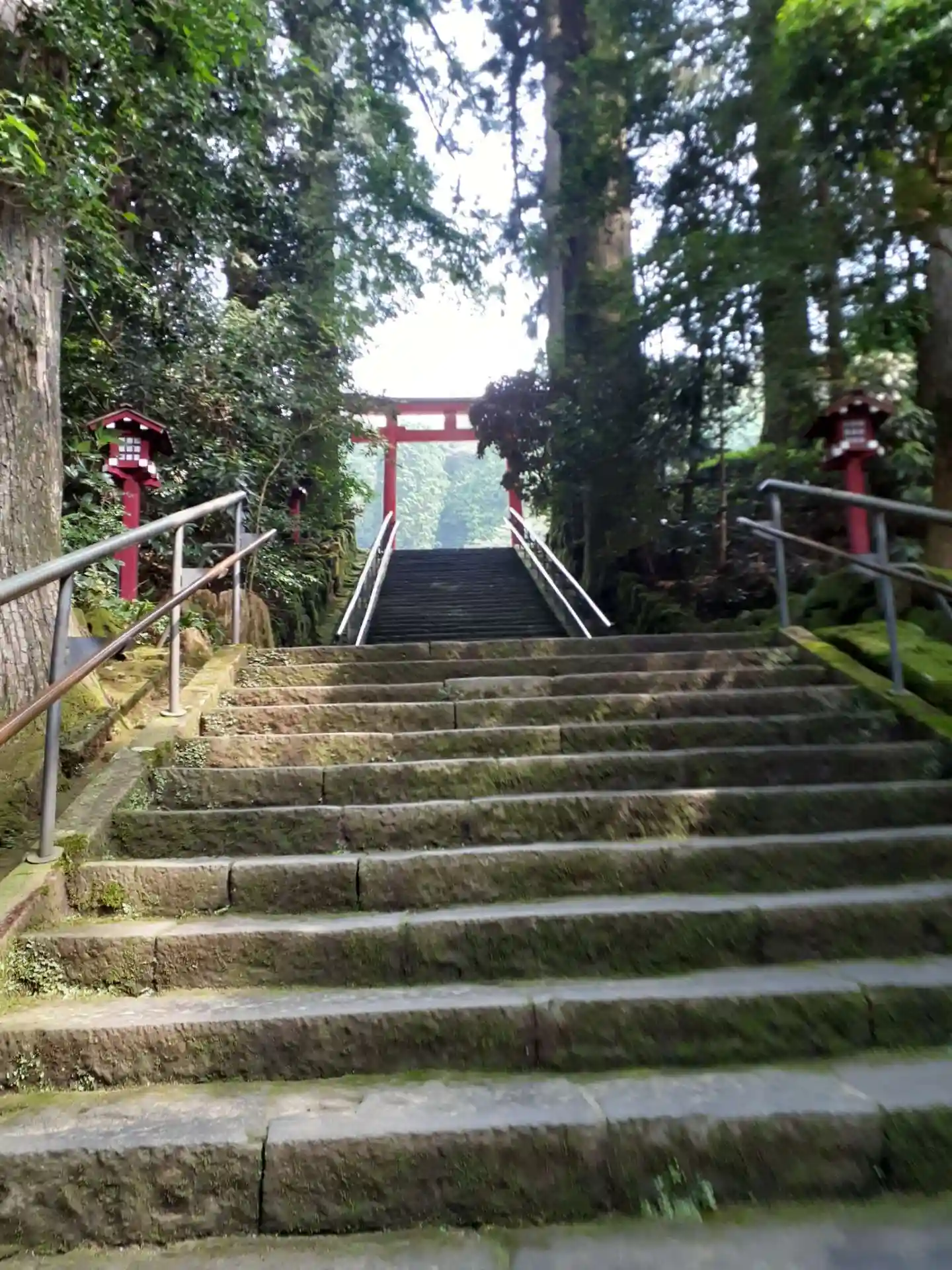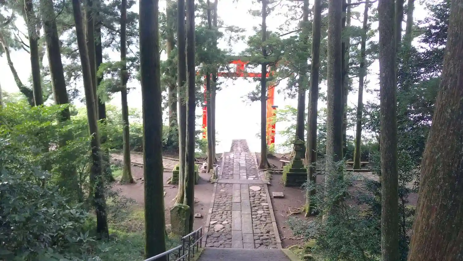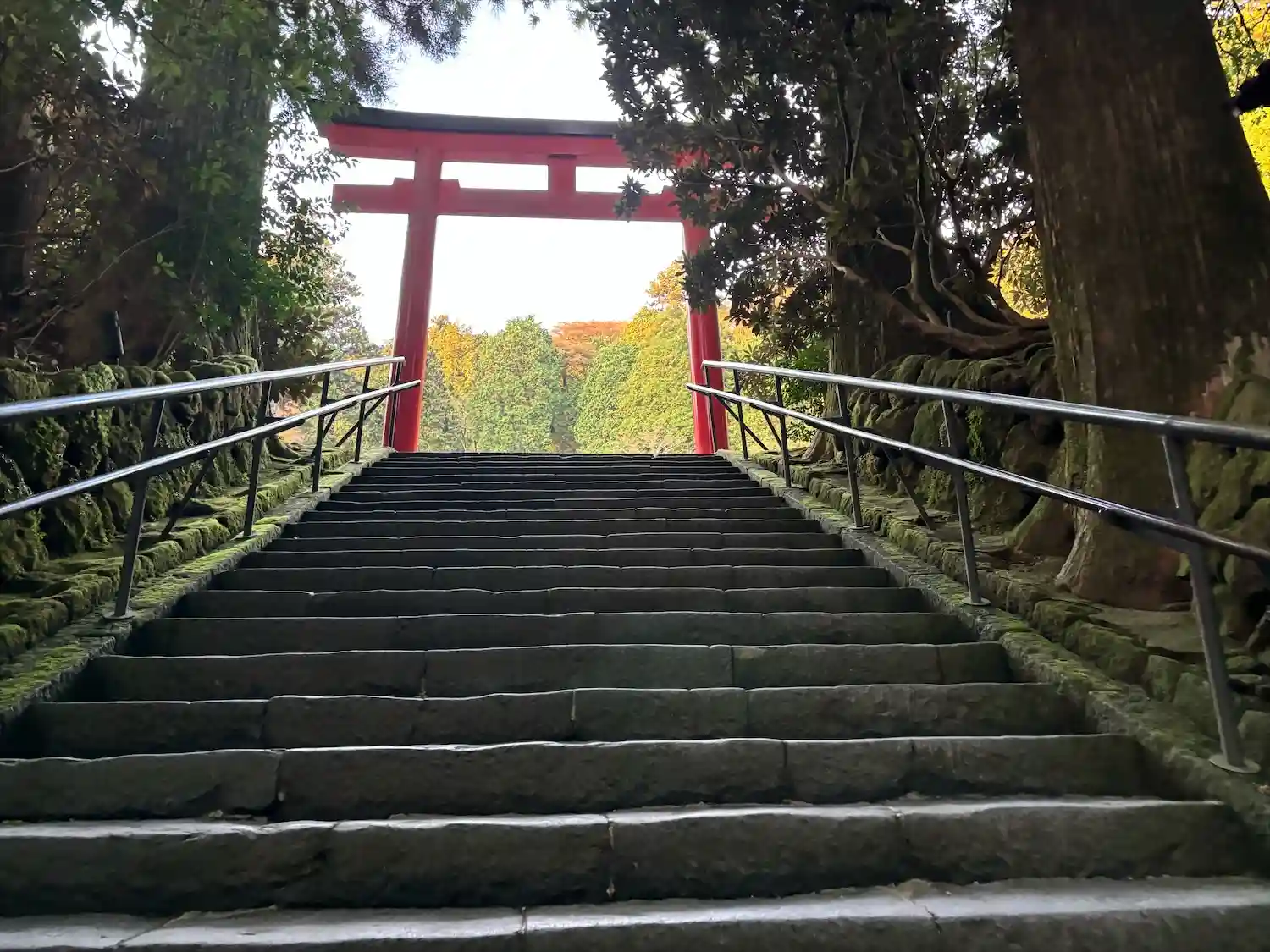 芦ノ湖の湖の上に建つ鳥居⛩から本殿まで一直線。階段は89段あり8(ヤ)9(ク)落としになるそう。